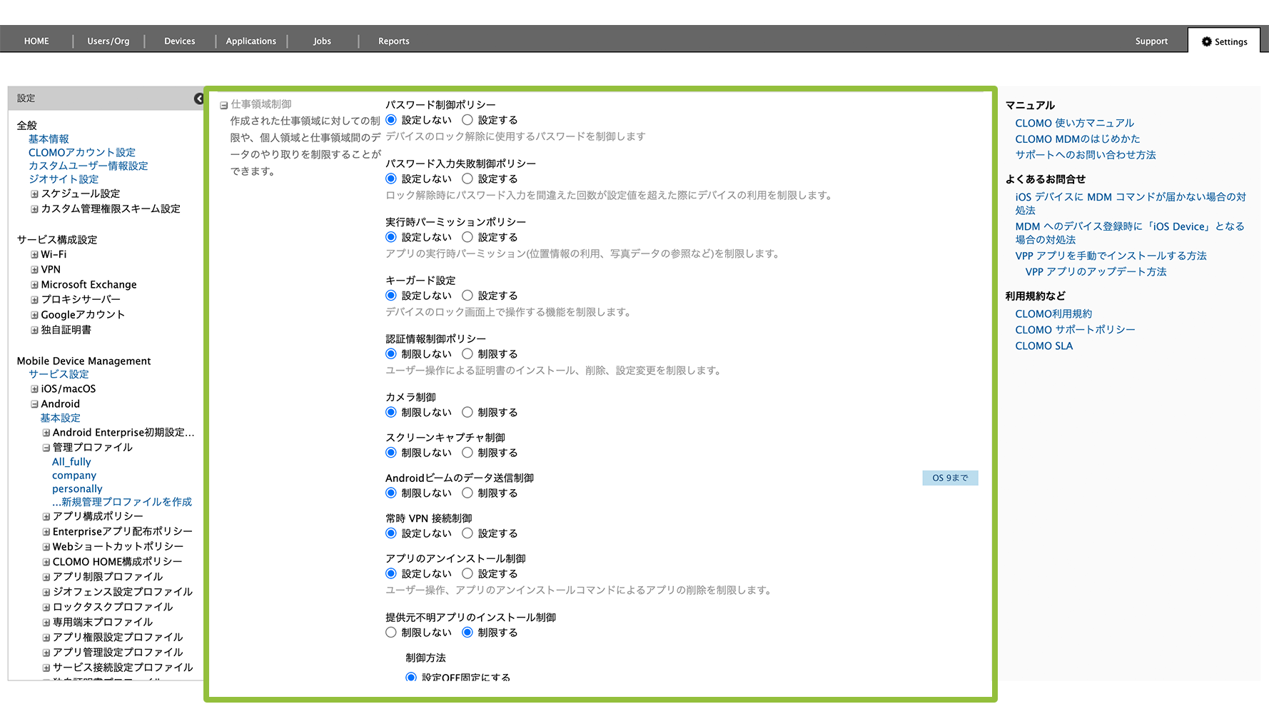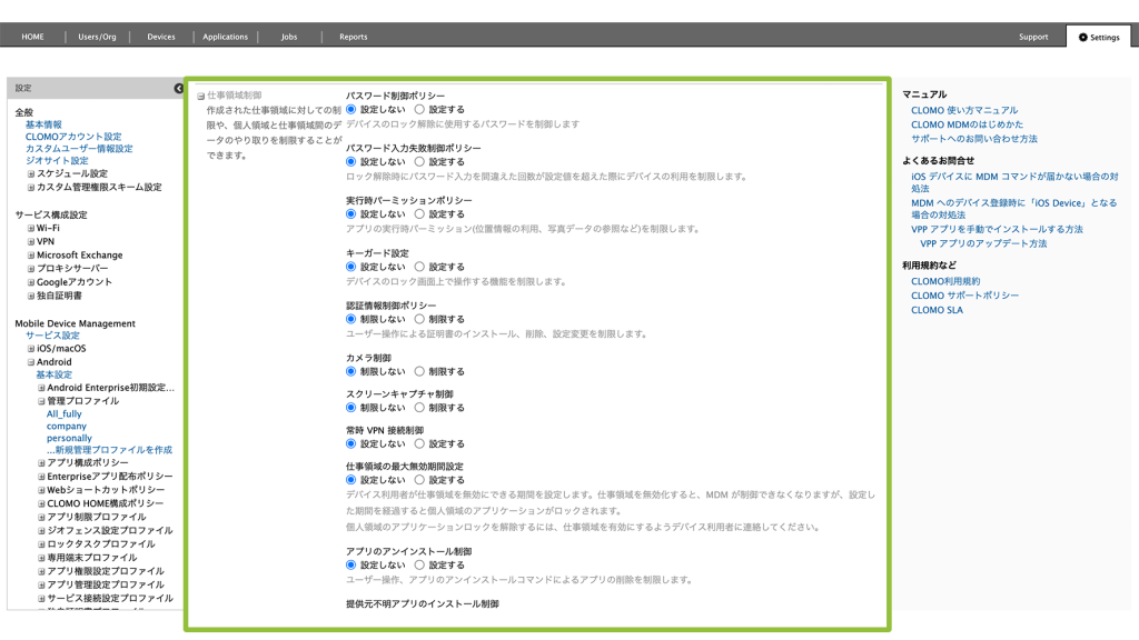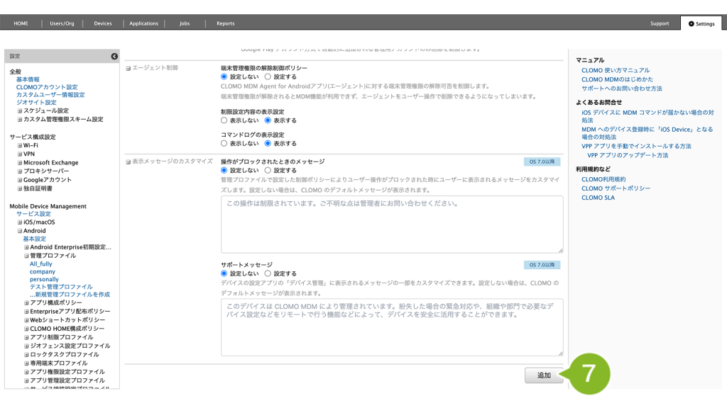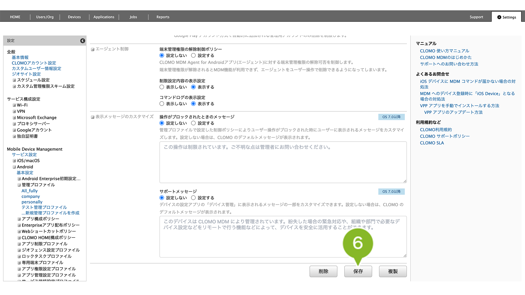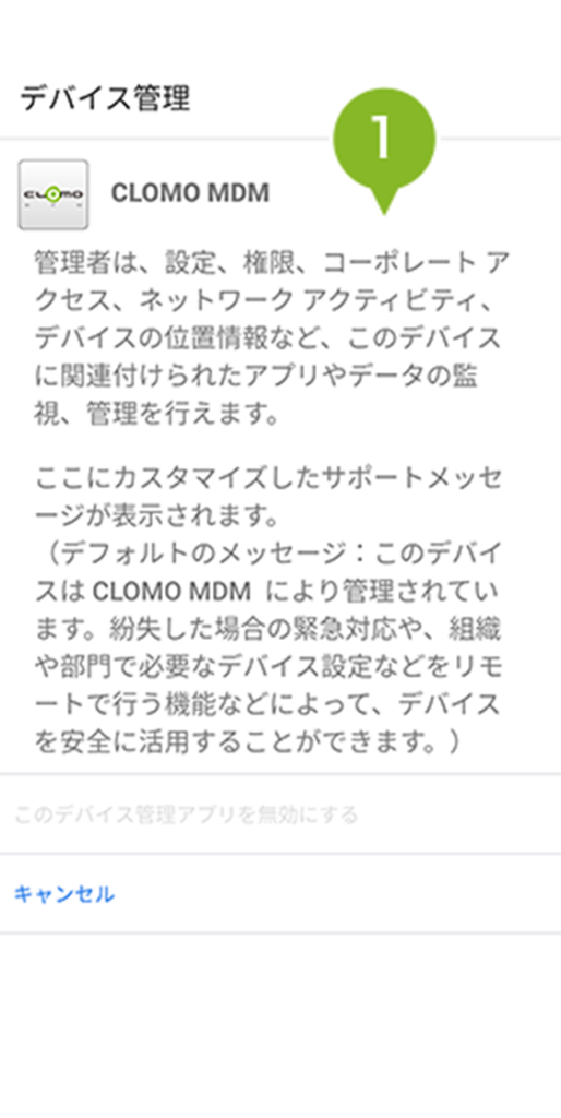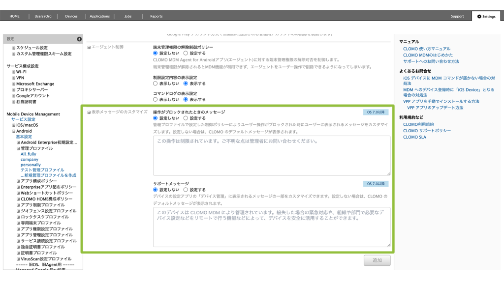 サポートメッセージ | 設定しない | デバイスの設定アプリの「デバイス管理」に表示されるメッセージの一部をカスタマイズできます。 表示メッセージのイメージは以下の「サポートメッセージ」をご確認ください。 | 設定すると、デバイスの設定アプリの「デバイス管理」にメッセージが表示されます。 CLOMO MDM による管理について説明できます。 | ー |
