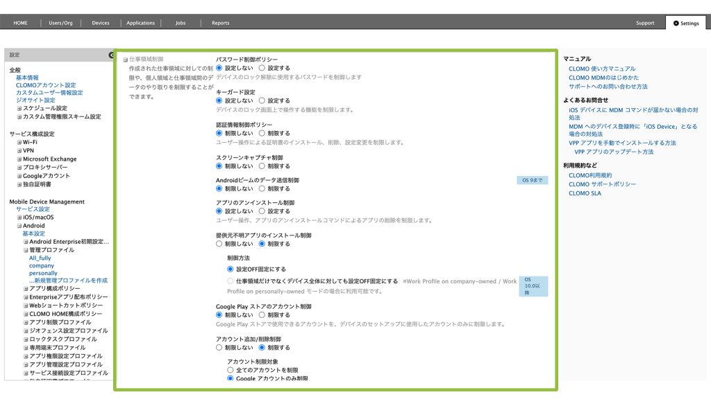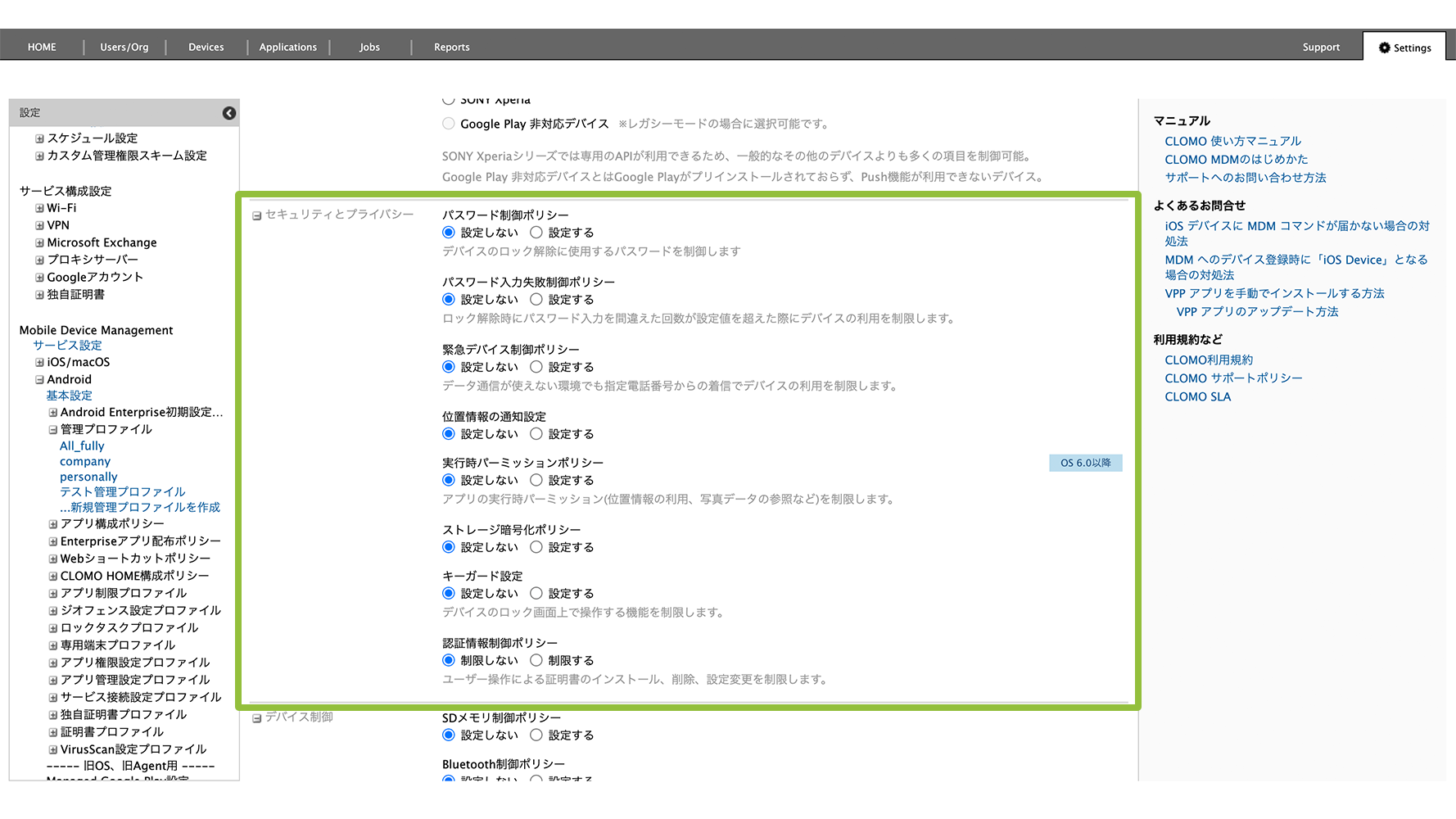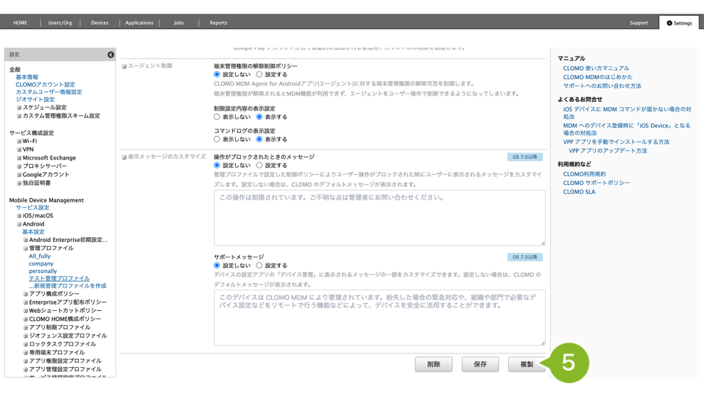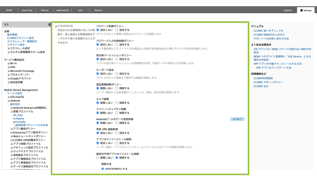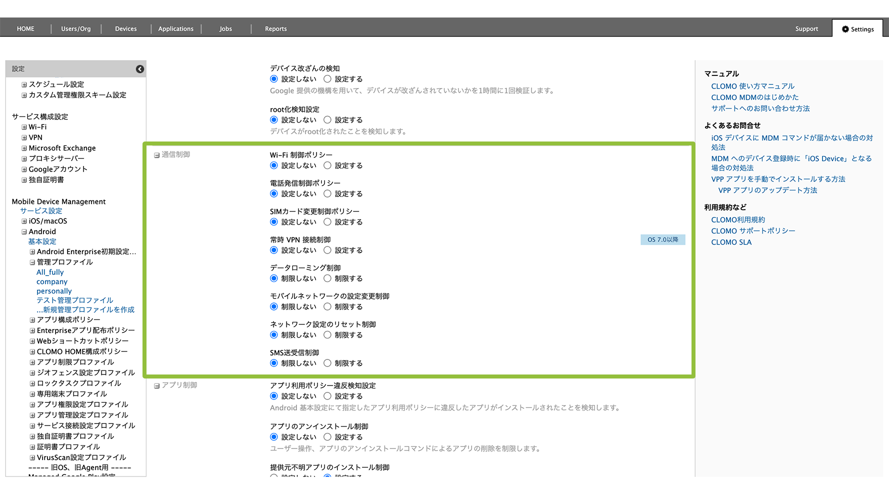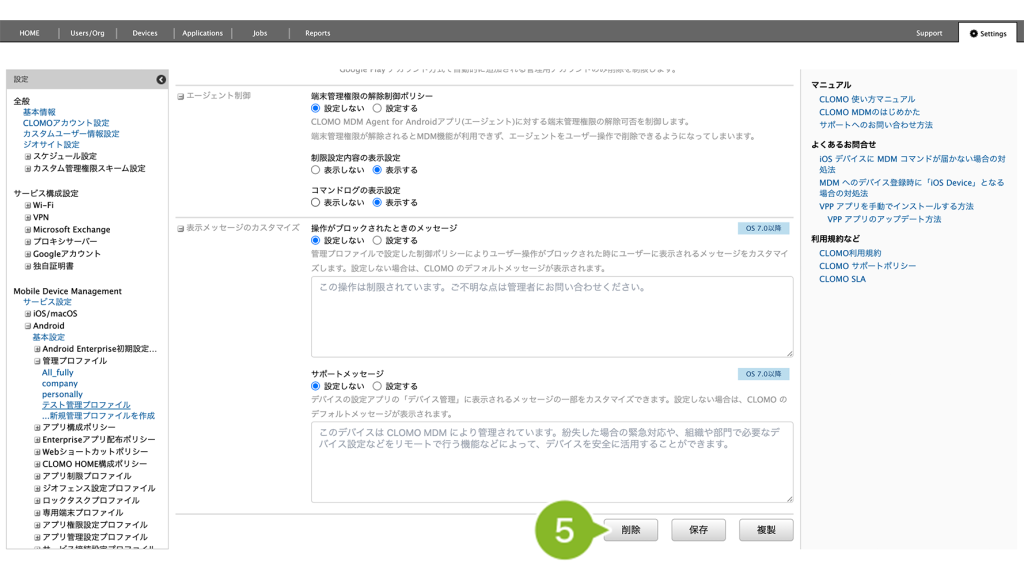 サポートメッセージ | 設定しない | デバイスの設定アプリの「デバイス管理」に表示されるメッセージの一部をカスタマイズできます。 表示メッセージのイメージは以下の「サポートメッセージ」をご確認ください。 | 設定すると、デバイスの設定アプリの「デバイス管理」にメッセージが表示されます。 CLOMO MDM による管理について説明できます。 | ー |