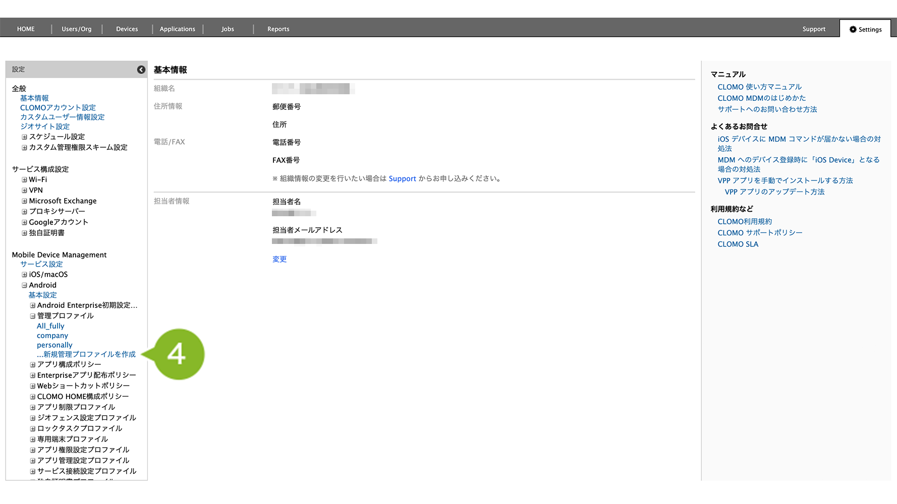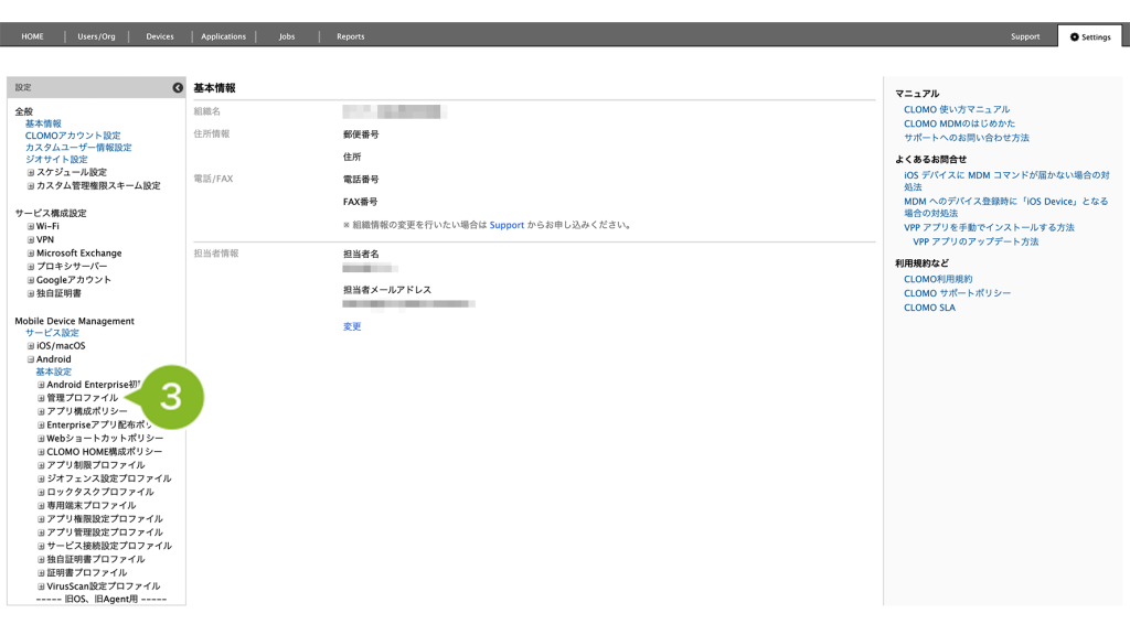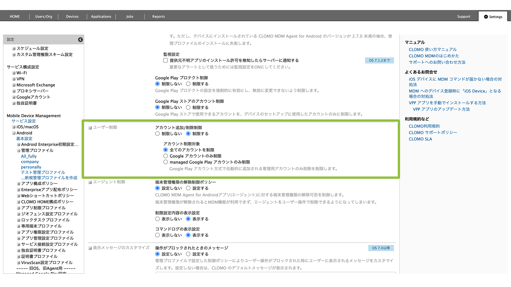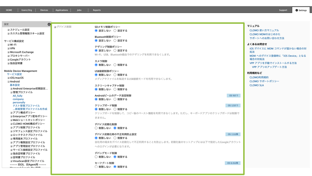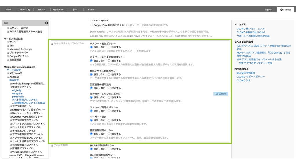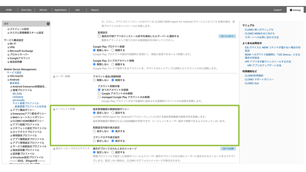 サポートメッセージ | 設定しない | デバイスの設定アプリの「デバイス管理」に表示されるメッセージの一部をカスタマイズできます。 表示メッセージのイメージは以下の「サポートメッセージ」をご確認ください。 | 設定すると、デバイスの設定アプリの「デバイス管理」にメッセージが表示されます。 CLOMO MDM による管理について説明できます。 | ー |