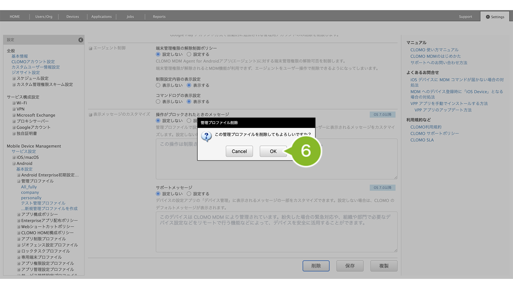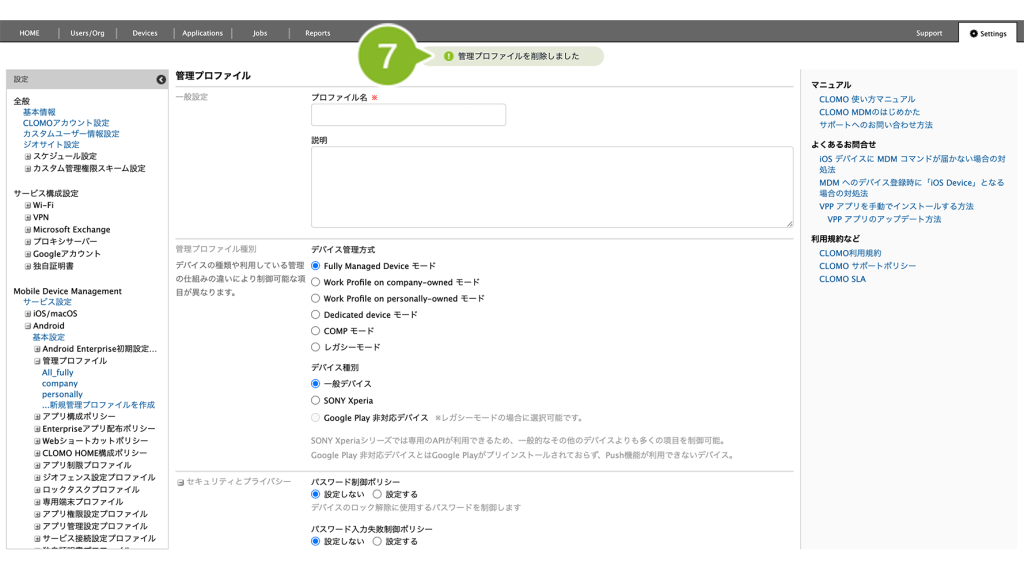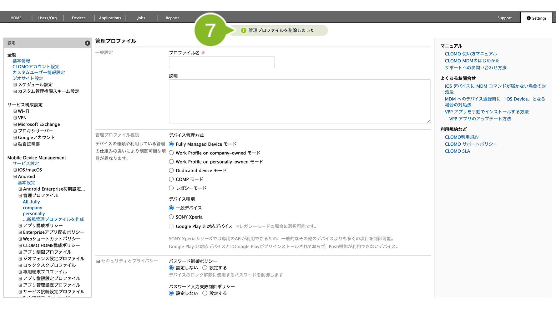 作成済みの管理プロファイルを削除する方法は、以下のとおりです。
