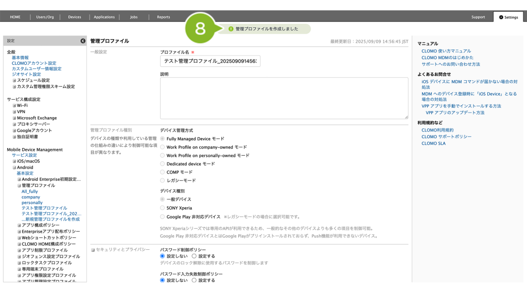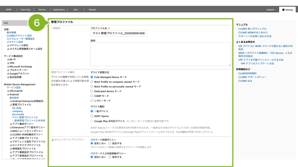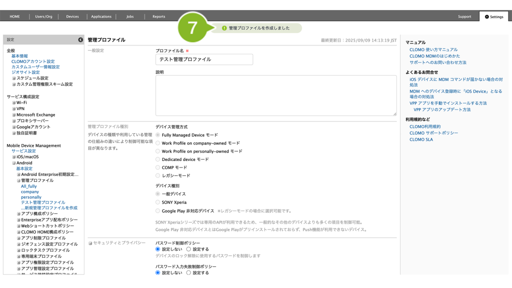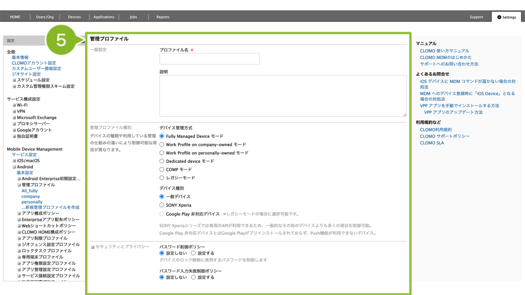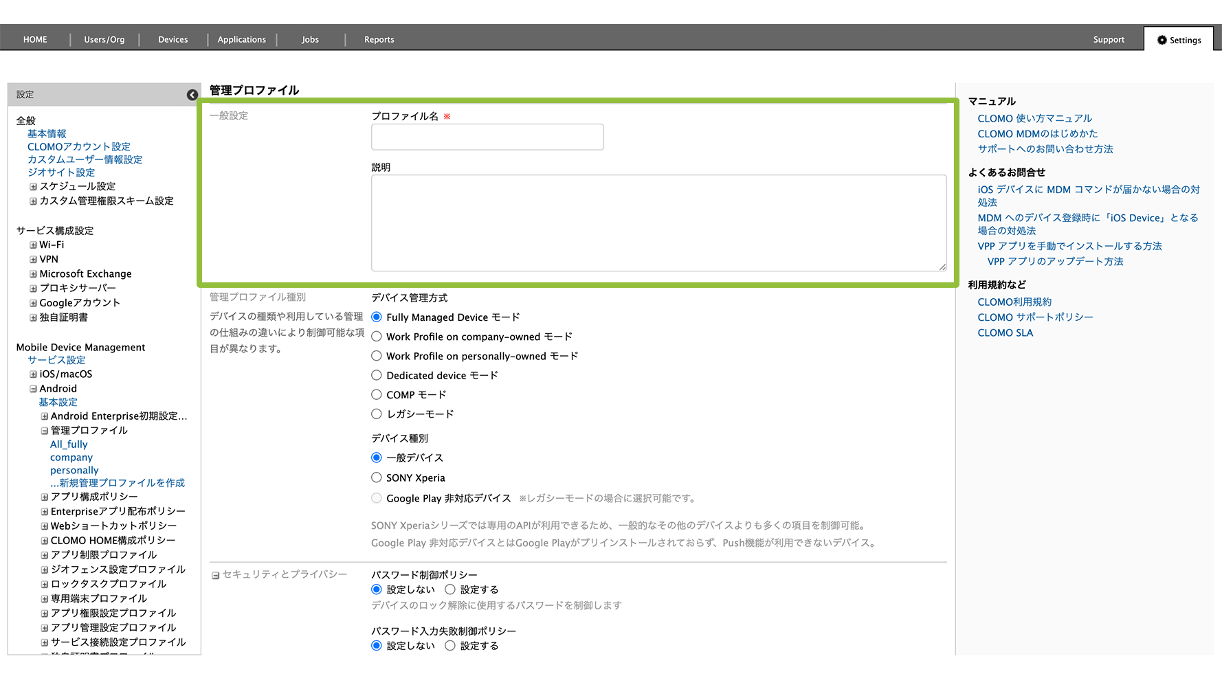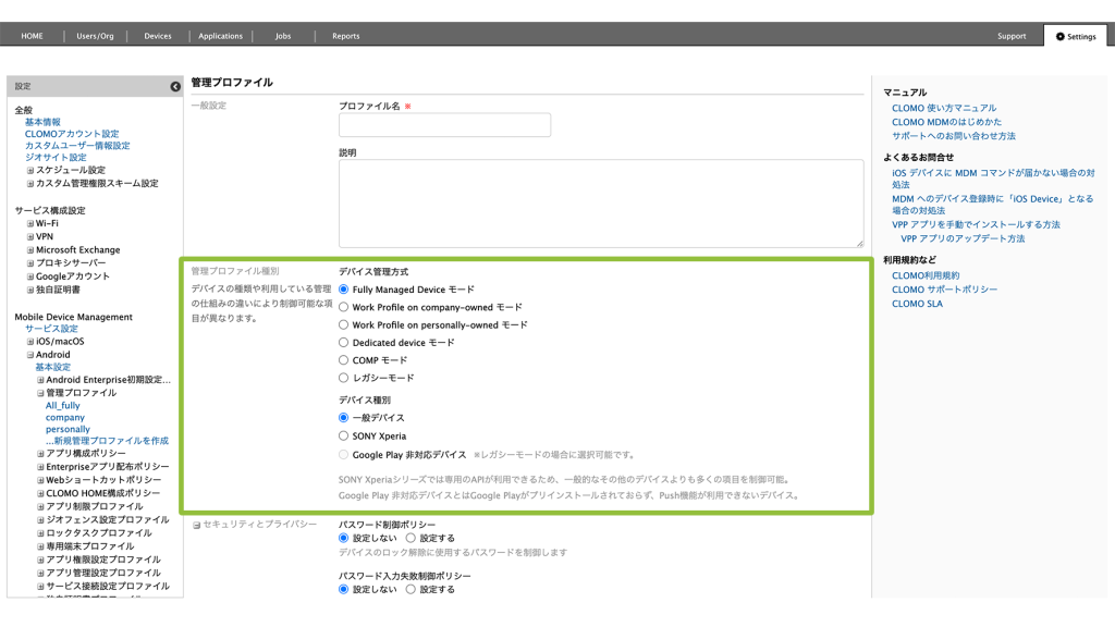管理プロファイルは、Android デバイスの機能を制限するプロファイルです。例えば、Wi-Fi の接続設定を指定したり、デバイスのロック解除に使用するパスワードを制御するなど、さまざまな制限ができます。