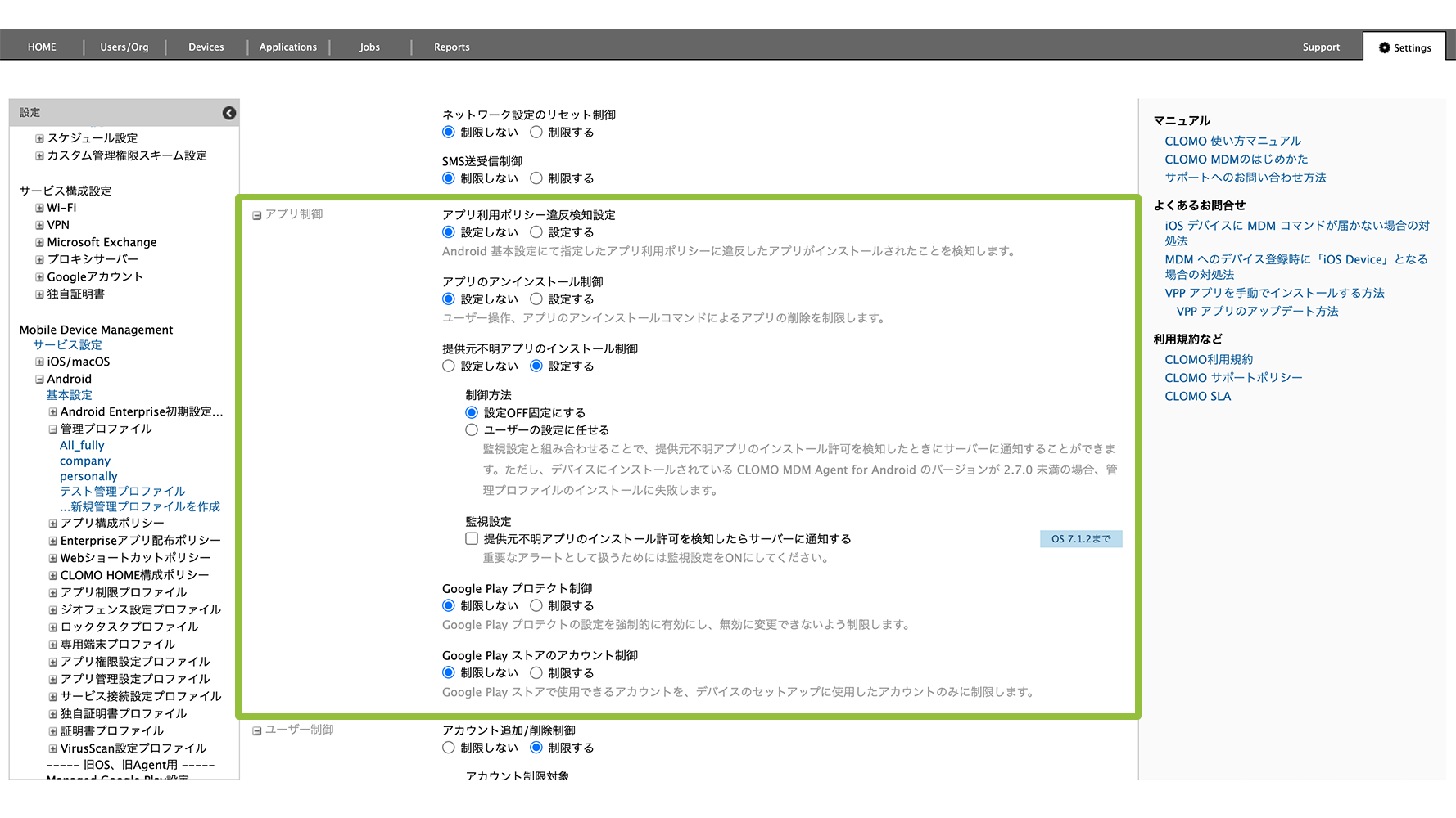*1: 一度デバイスに設定すると、管理プロファイルの変更のみでは解除することができません。状態を戻すためには、該当アプリの再インストールもしくは、デバイスの初期化が必要です。