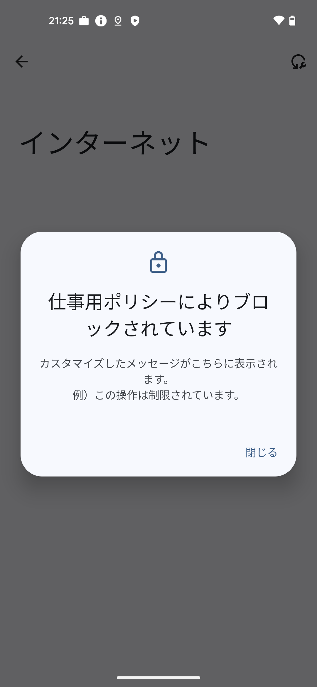 | 操作がブロックされた時のメッセージ | 設定しない | 管理プロファイルで設定した制限ポリシーにより、ユーザー操作がブロックされた場合に画面に表示されるメッセージを設定できます。 表示メッセージのイメージは以下の「操作がブロックされた時のメッセージ」をご確認ください。 | 設定すると、制限をかけた操作をおこなった場合にメッセージが表示されるため、どうして操作できないのかユーザーにお知らせができます。 | ー |
