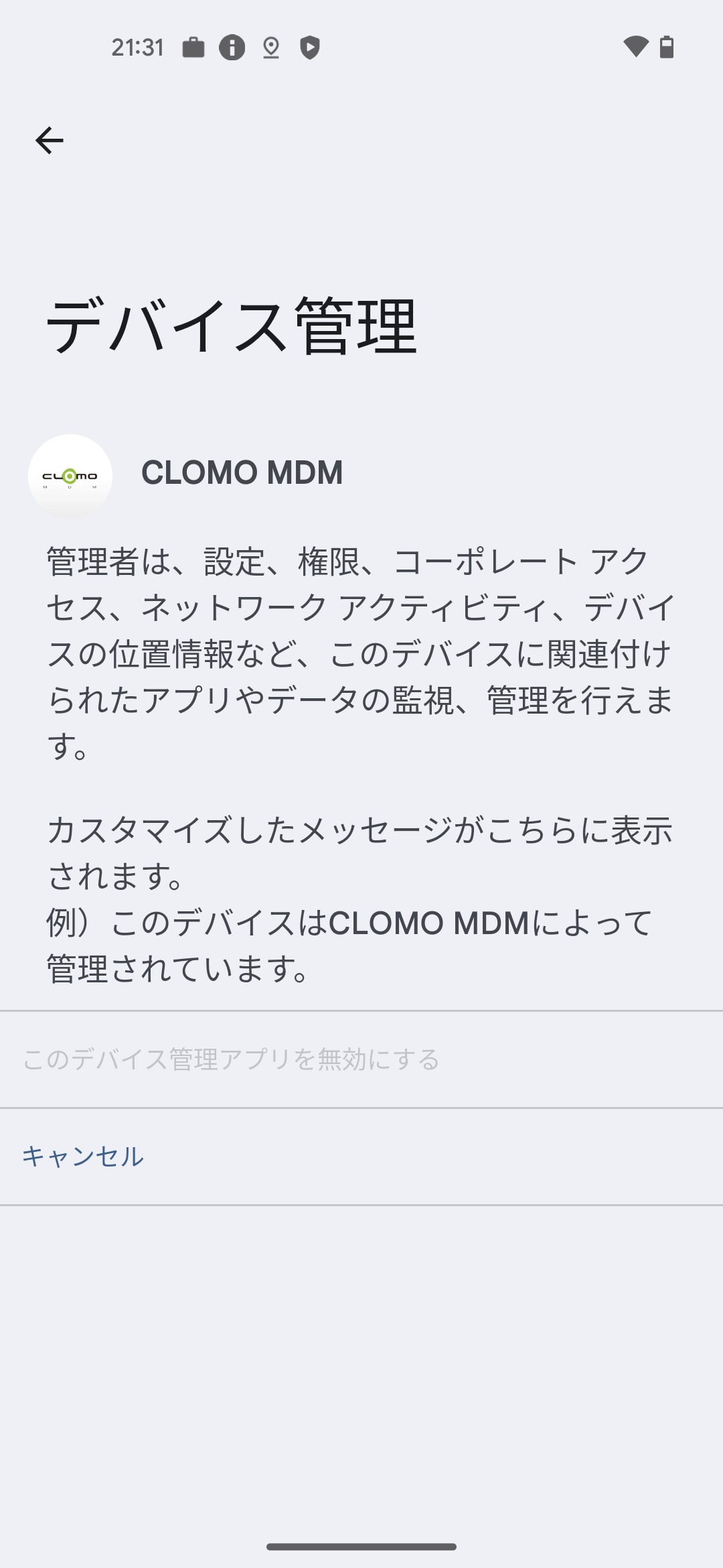 | サポートメッセージ | 設定しない | デバイスの設定アプリの「デバイス管理」に表示されるメッセージの一部をカスタマイズできます。 表示メッセージのイメージは以下の「サポートメッセージ」をご確認ください。 | 設定すると、デバイスの設定アプリの「デバイス管理」にメッセージが表示されます。 CLOMO MDM による管理について説明できます。 | ー |