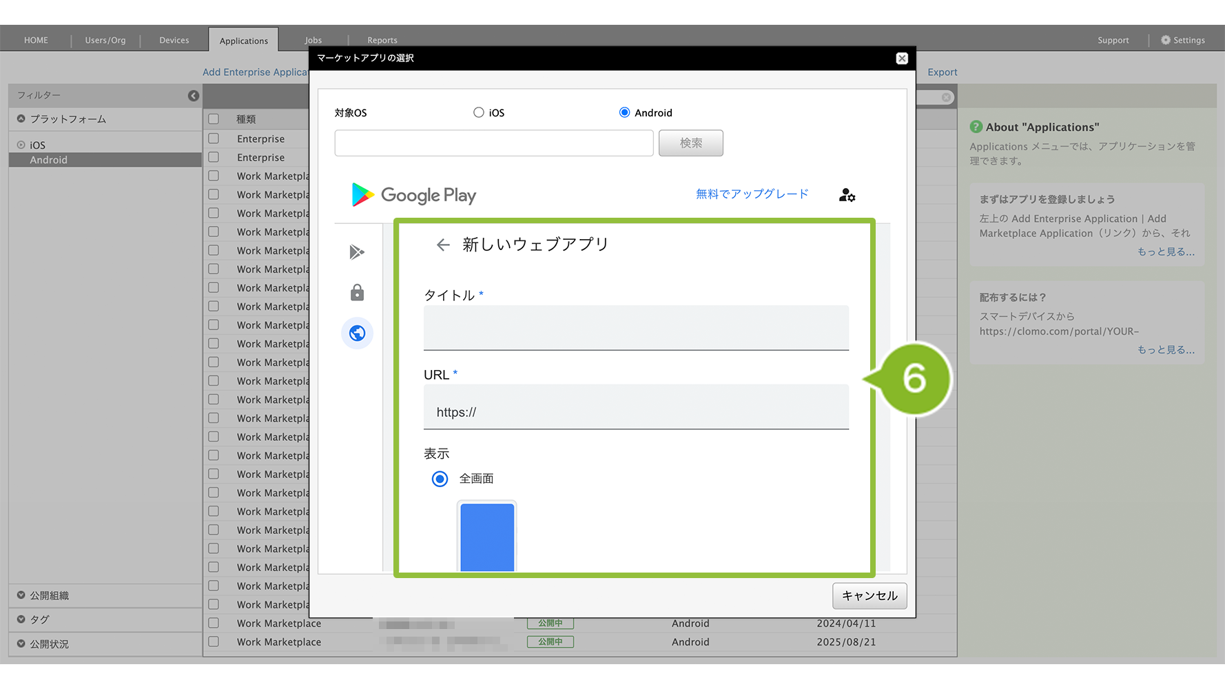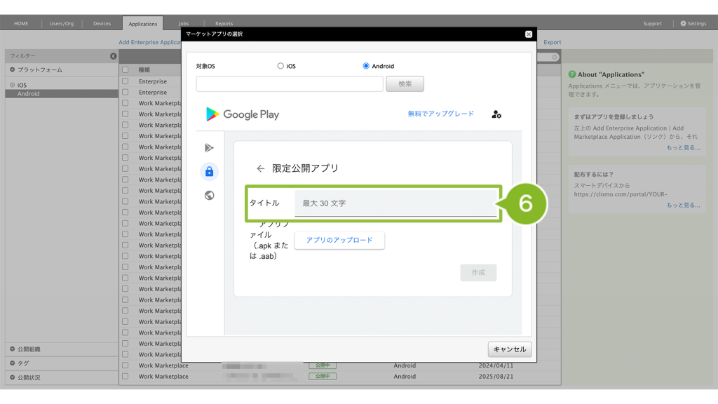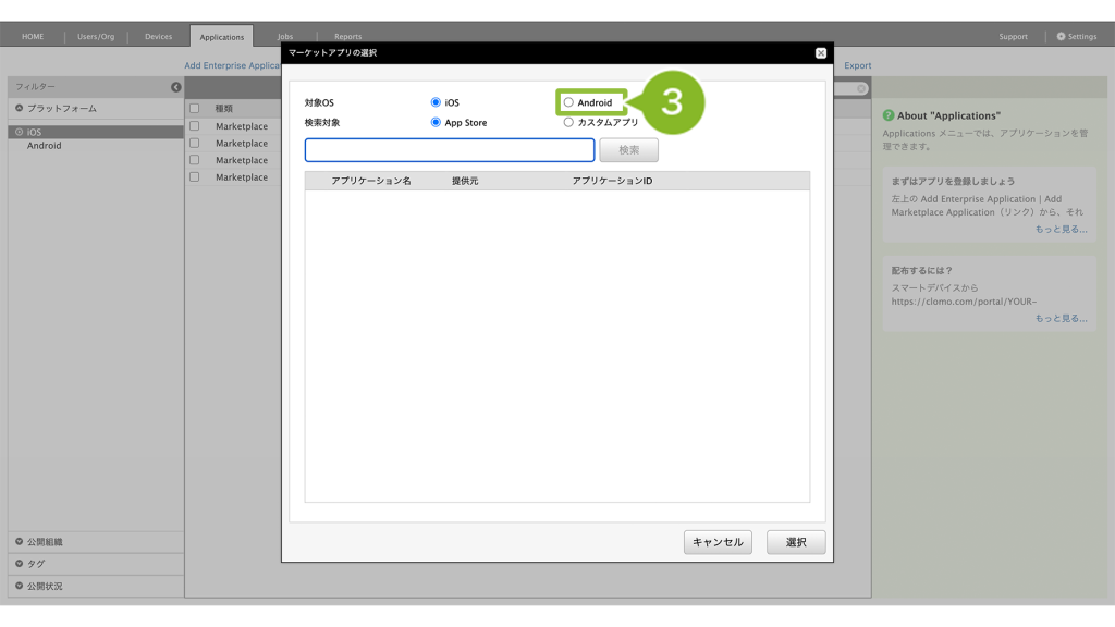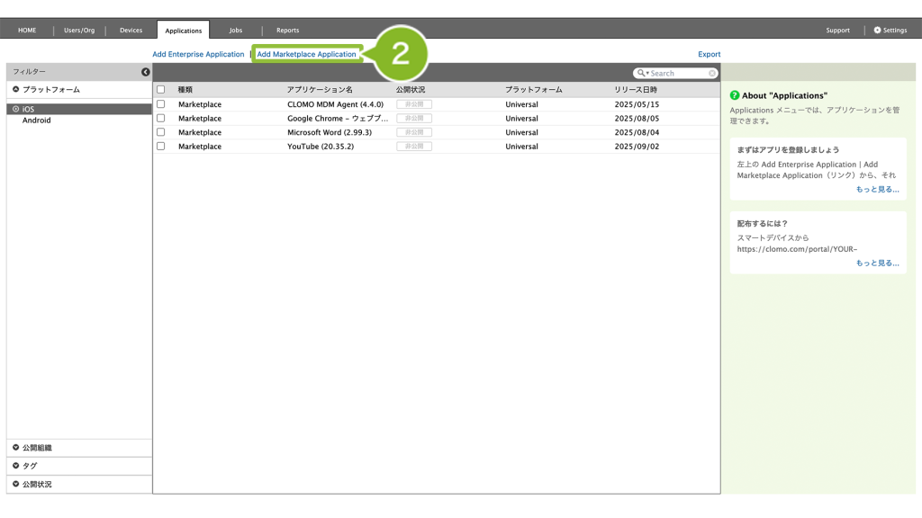 ※ apk ファイルを直接 Applications 画面に登録して配布する方式、Enterprise アプリケーションの登録方法は、Applications 画面にアプリケーションを登録する(Enterprise アプリケーション)をご確認ください。