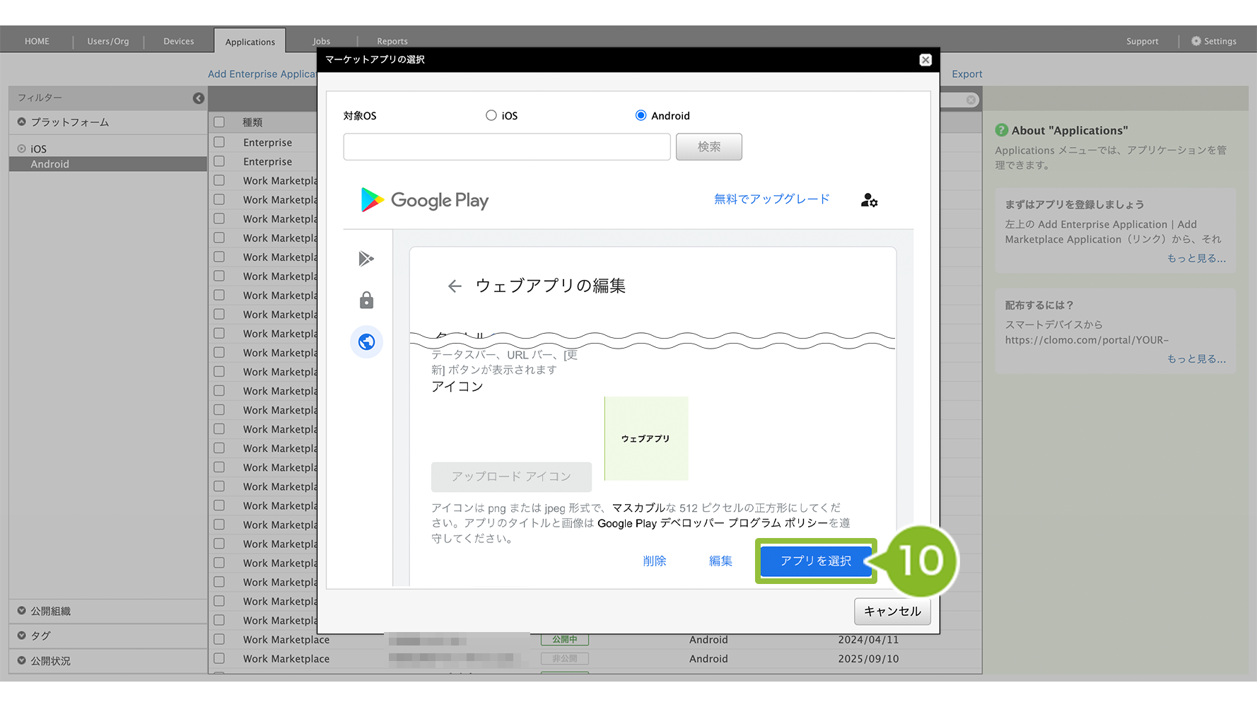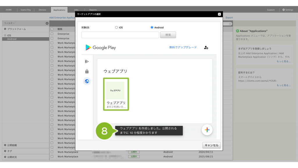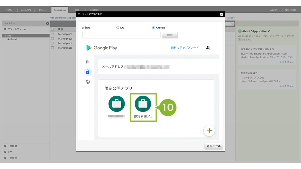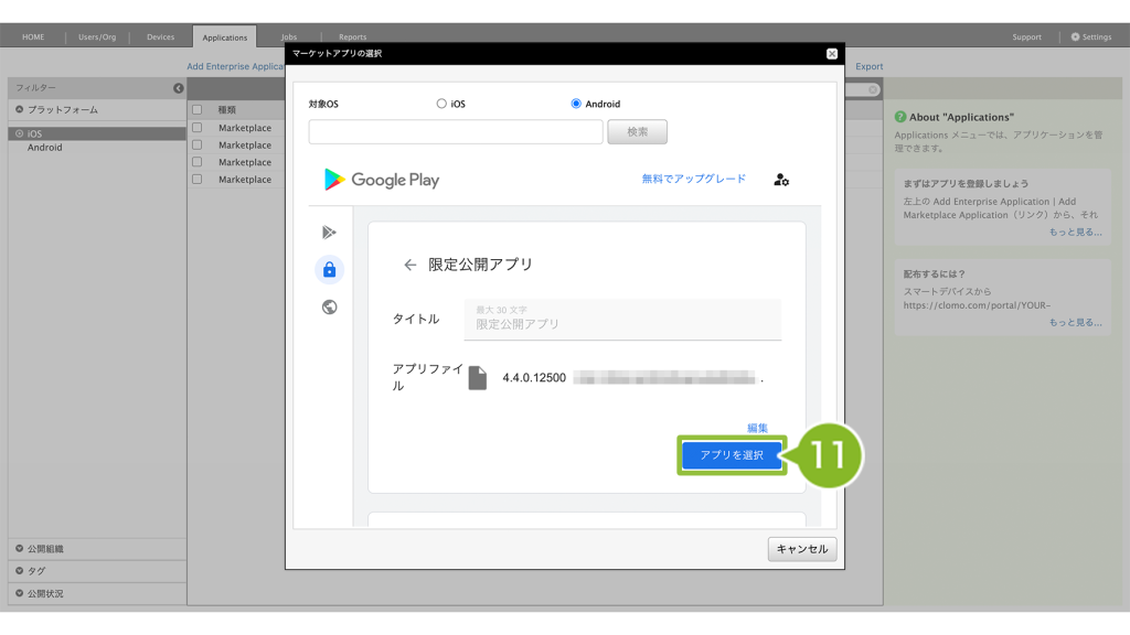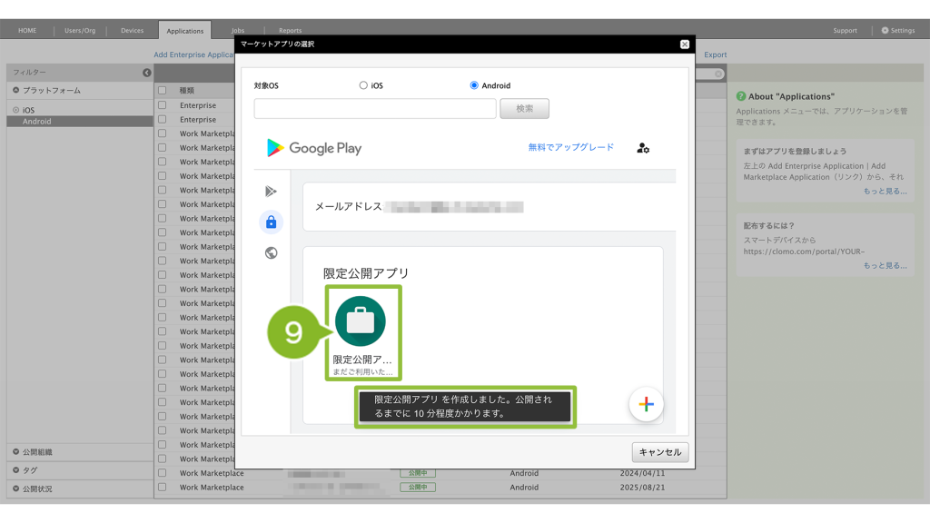 10. 10分程度経過後、再び限定公開アプリ画面を開き、先の手順で設定した限定公開アプリを選択します。
