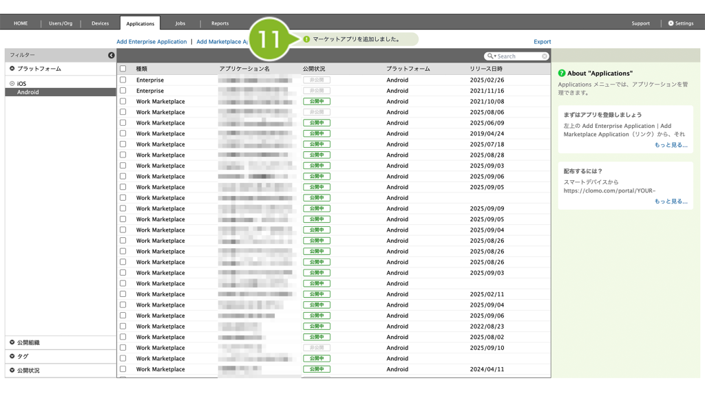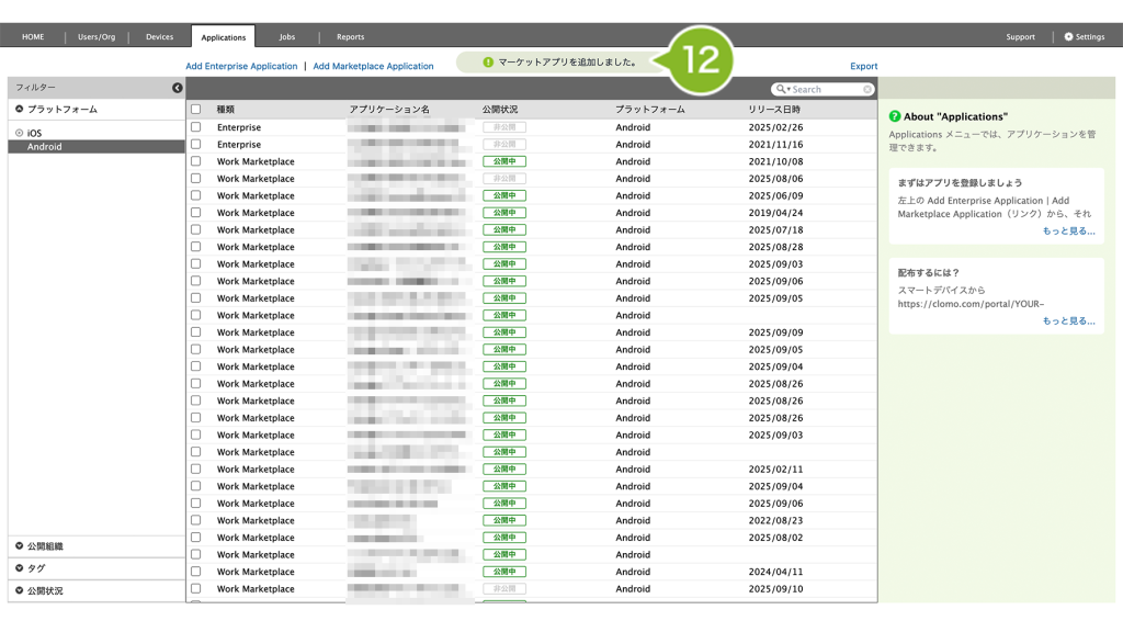 Applications 画面にインストールしたいアプリケーションを登録すると、Android Enterprise デバイスへアプリケーションを配布できるようになります。