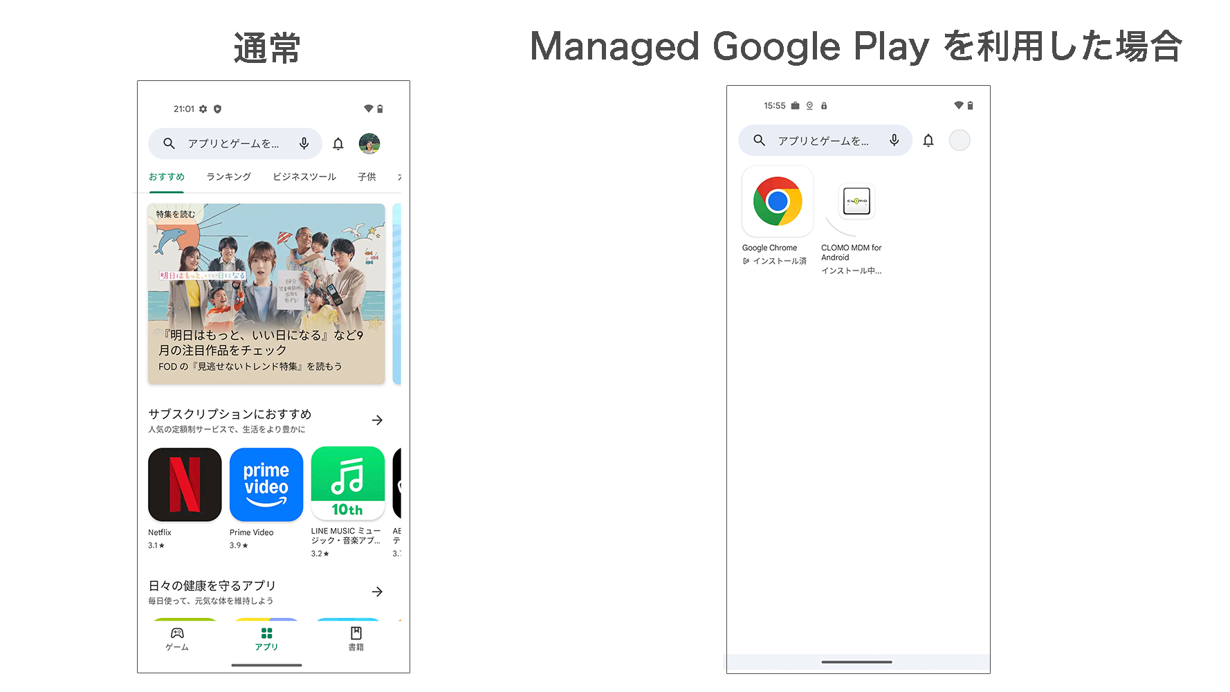 Google 社提供の「Managed Google Play」を利用して配布する仕組みです。