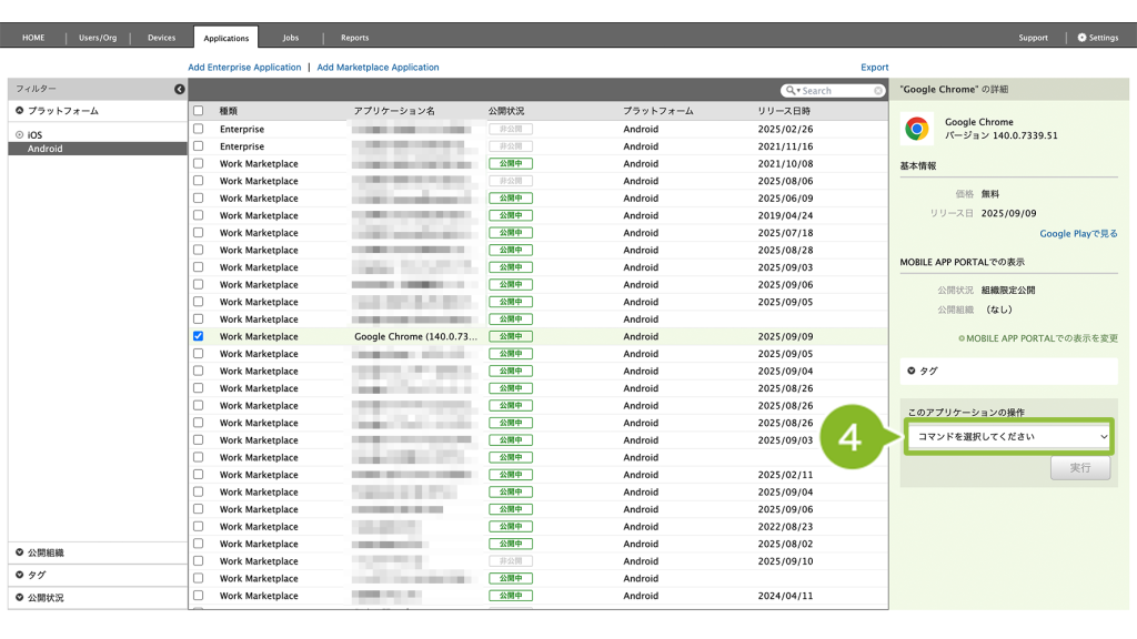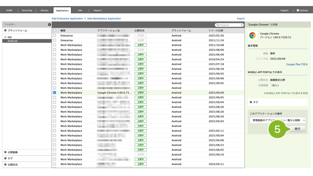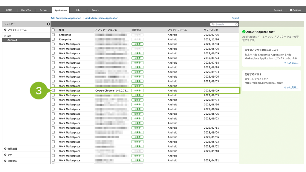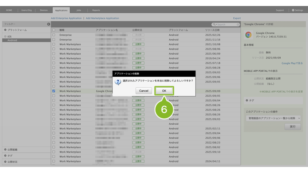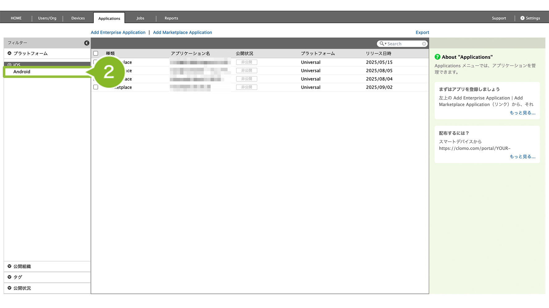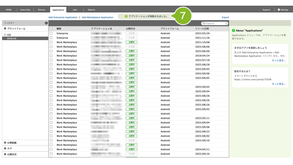 ※ すでにデバイスに配布済みのアプリケーションを Applications 画面から削除しても、デバイス側でアンインストールされることはありません。