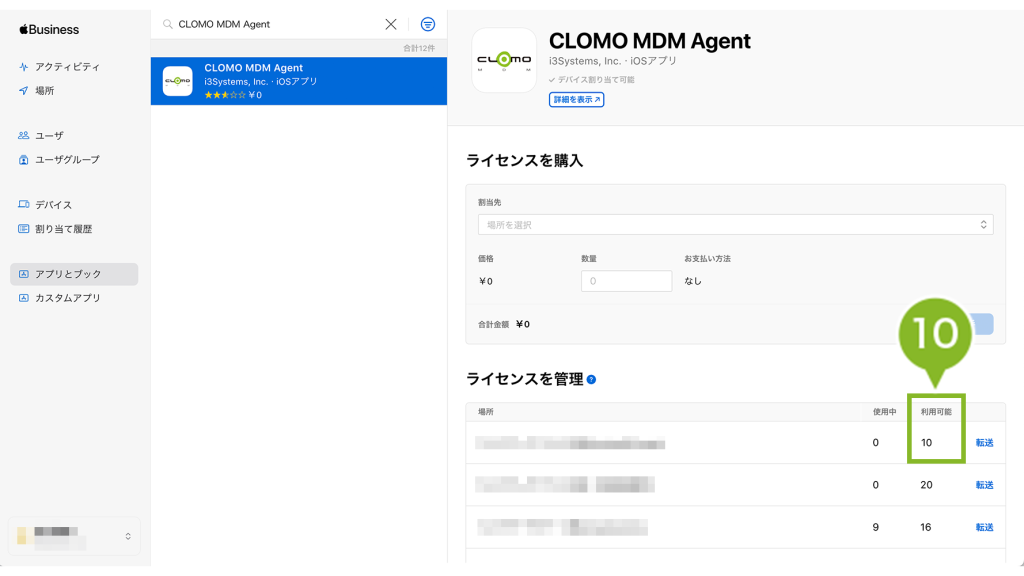 10. 購入が完了すると、「ライセンスを管理」項目の「利用可能」の数量が更新されます。