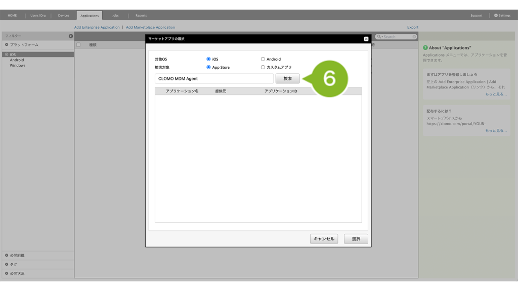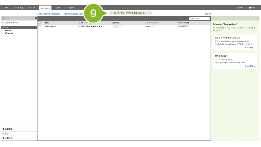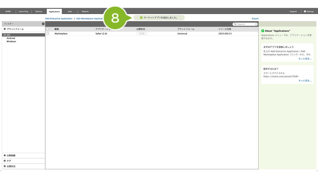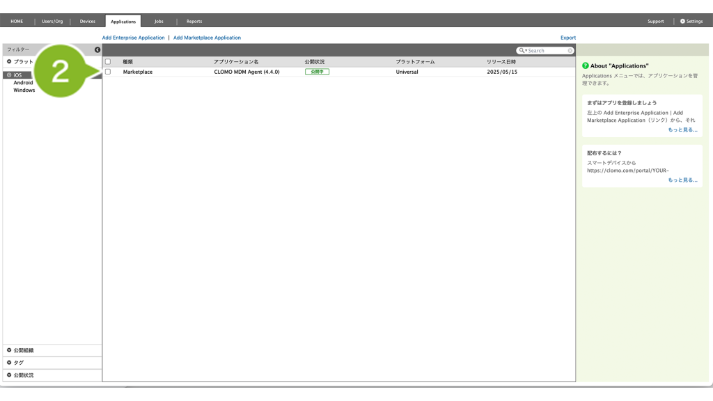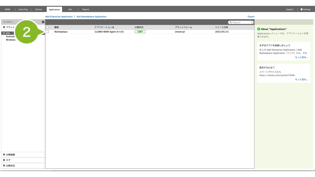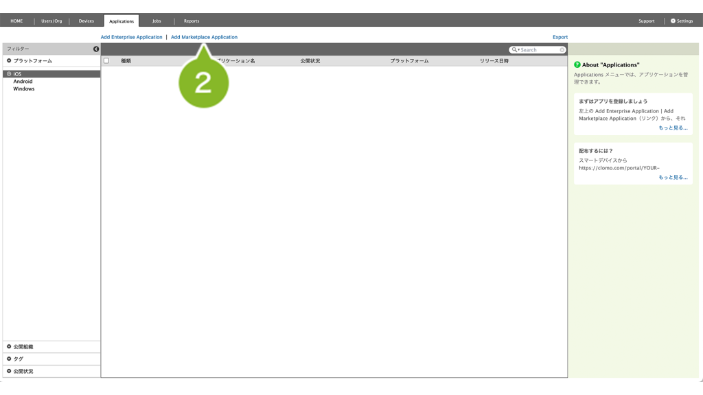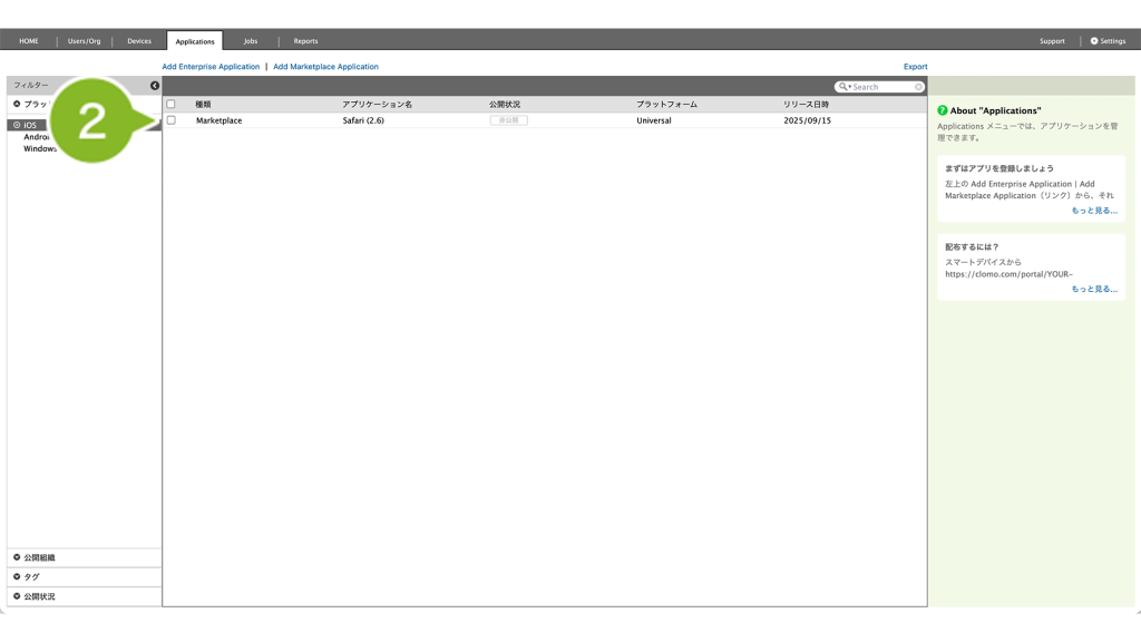 CLOMO で配布したいアプリケーションは、まず Applications 画面に登録する必要があります。