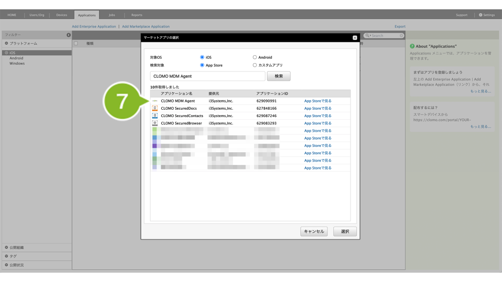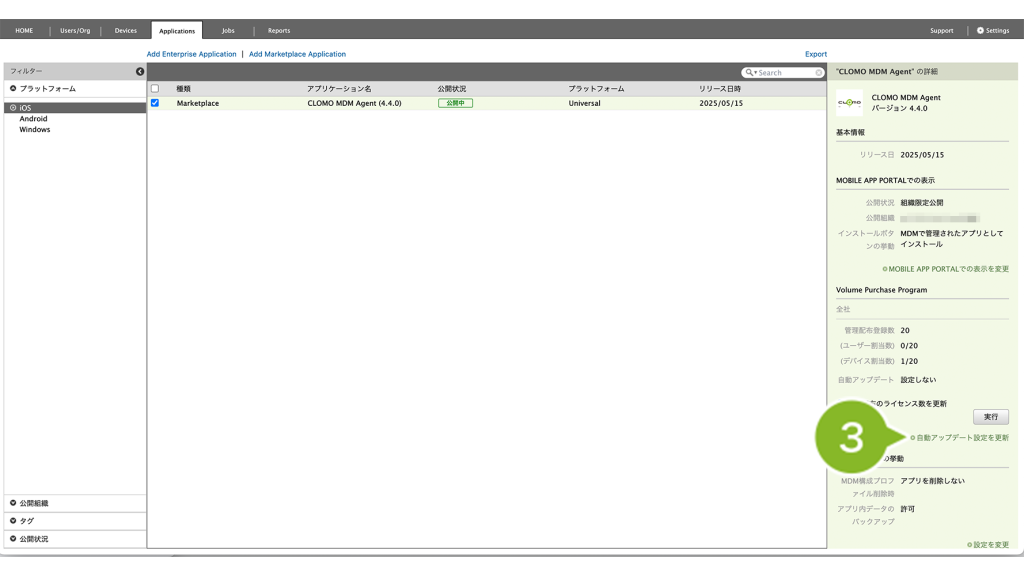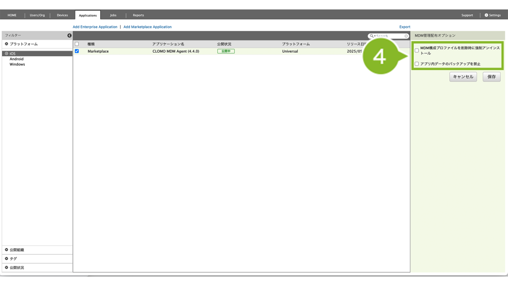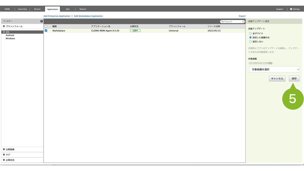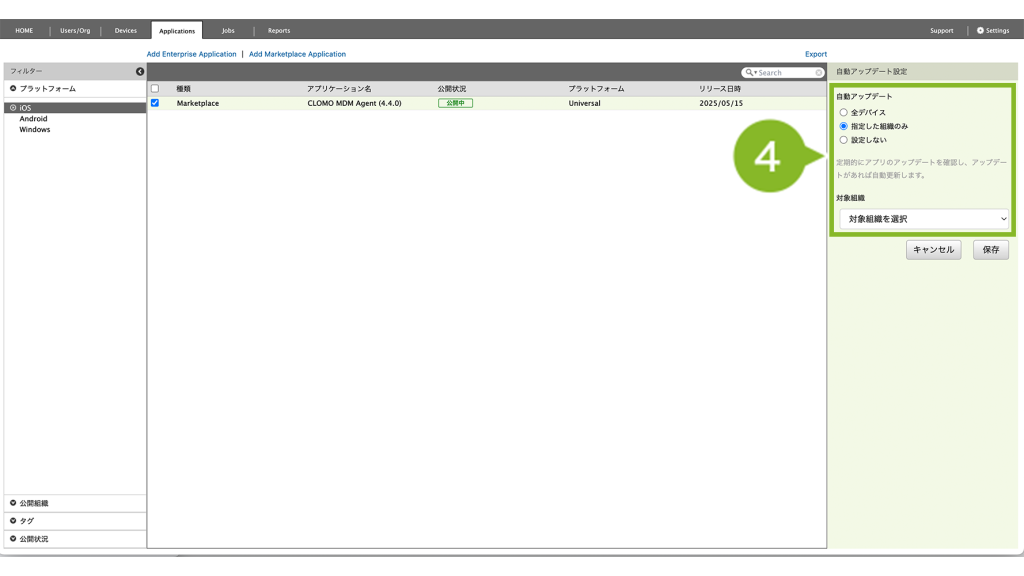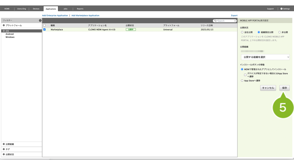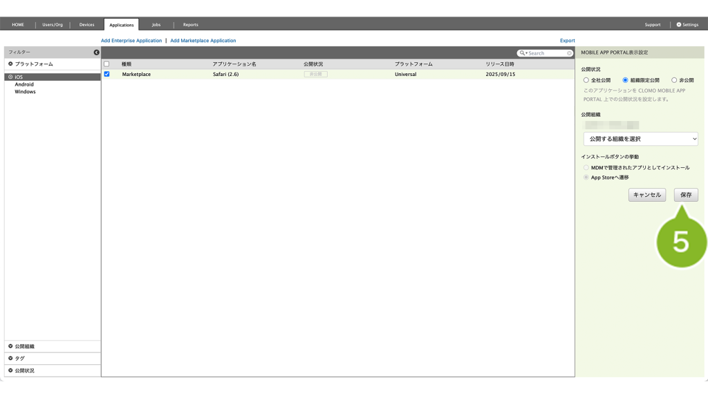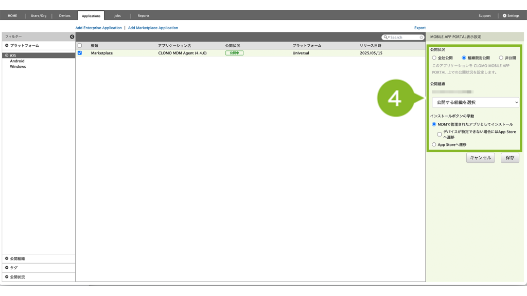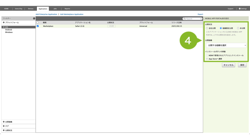 公開組織 | CLOMO MOBILE APP PORTAL 上で、特定の組織にのみアプリケーションを表示させたい場合に設定します。 | 「MOBILE APP PORTALでの表示を変更」について |