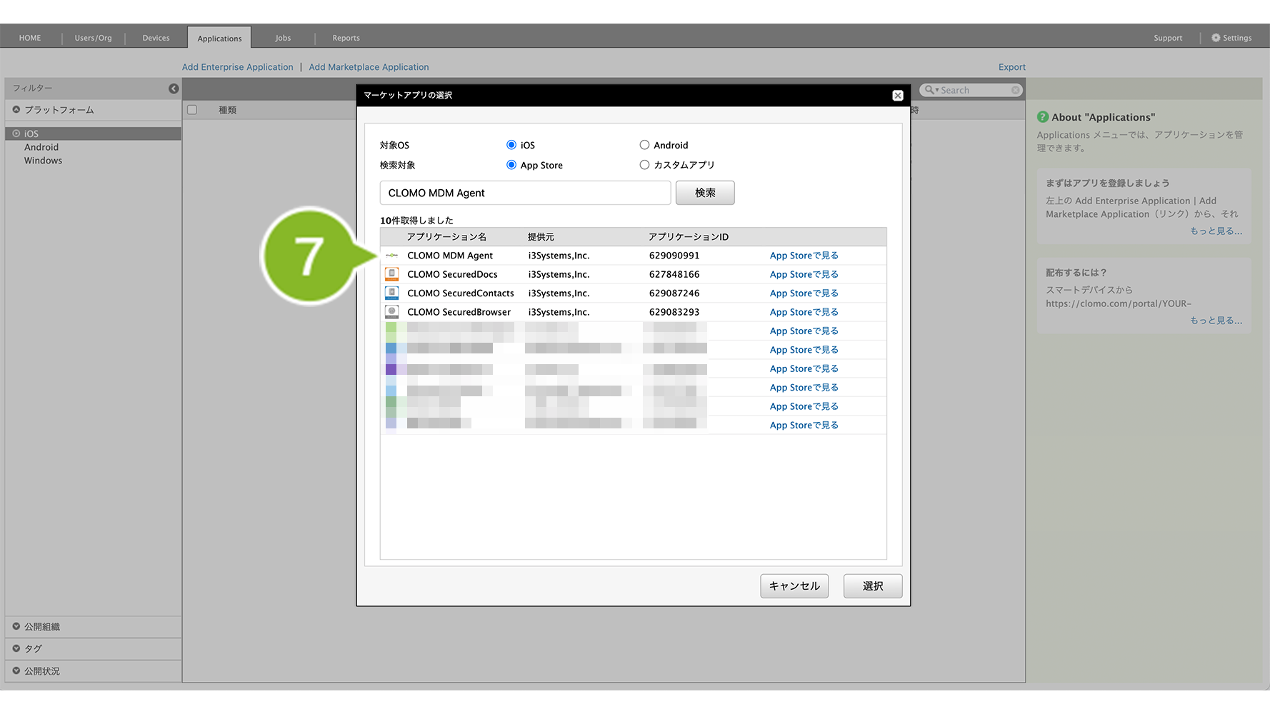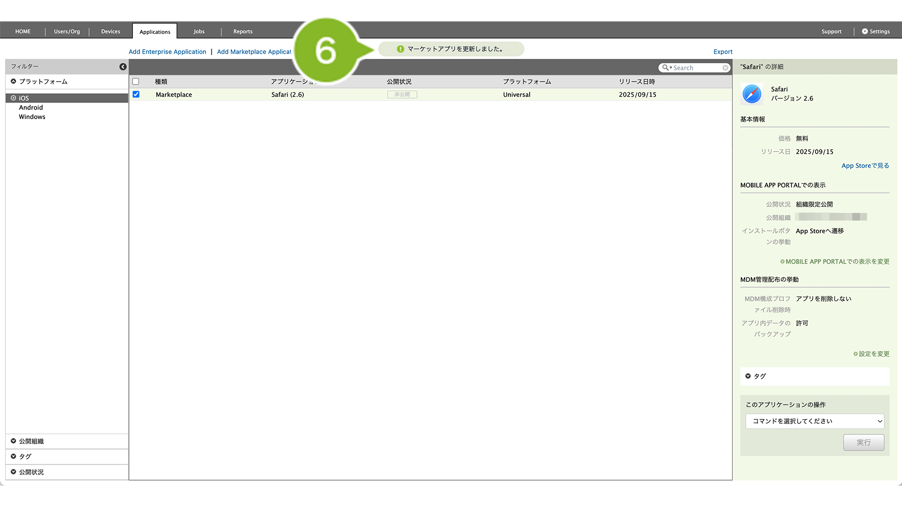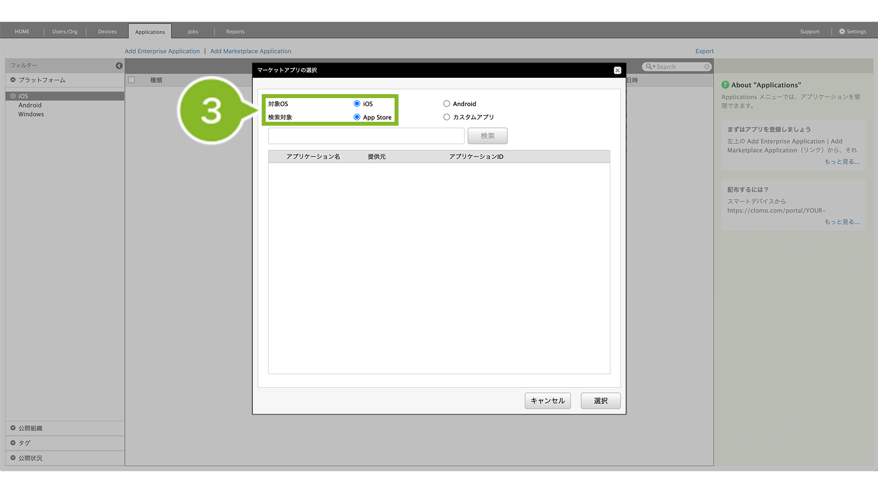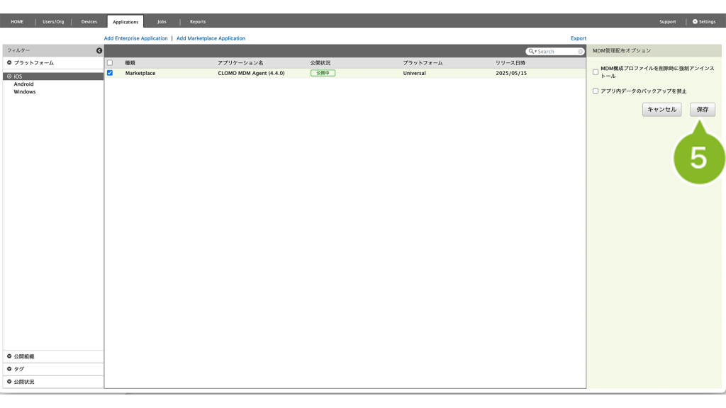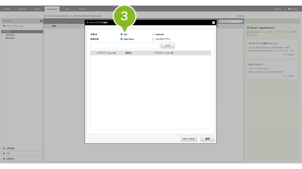 公開組織 | CLOMO MOBILE APP PORTAL 上で、特定の組織にのみアプリケーションを表示させたい場合に設定します。 | 「MOBILE APP PORTALでの表示を変更」について |
