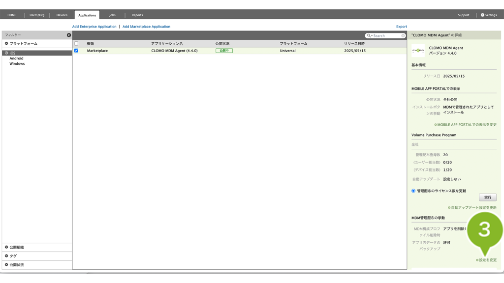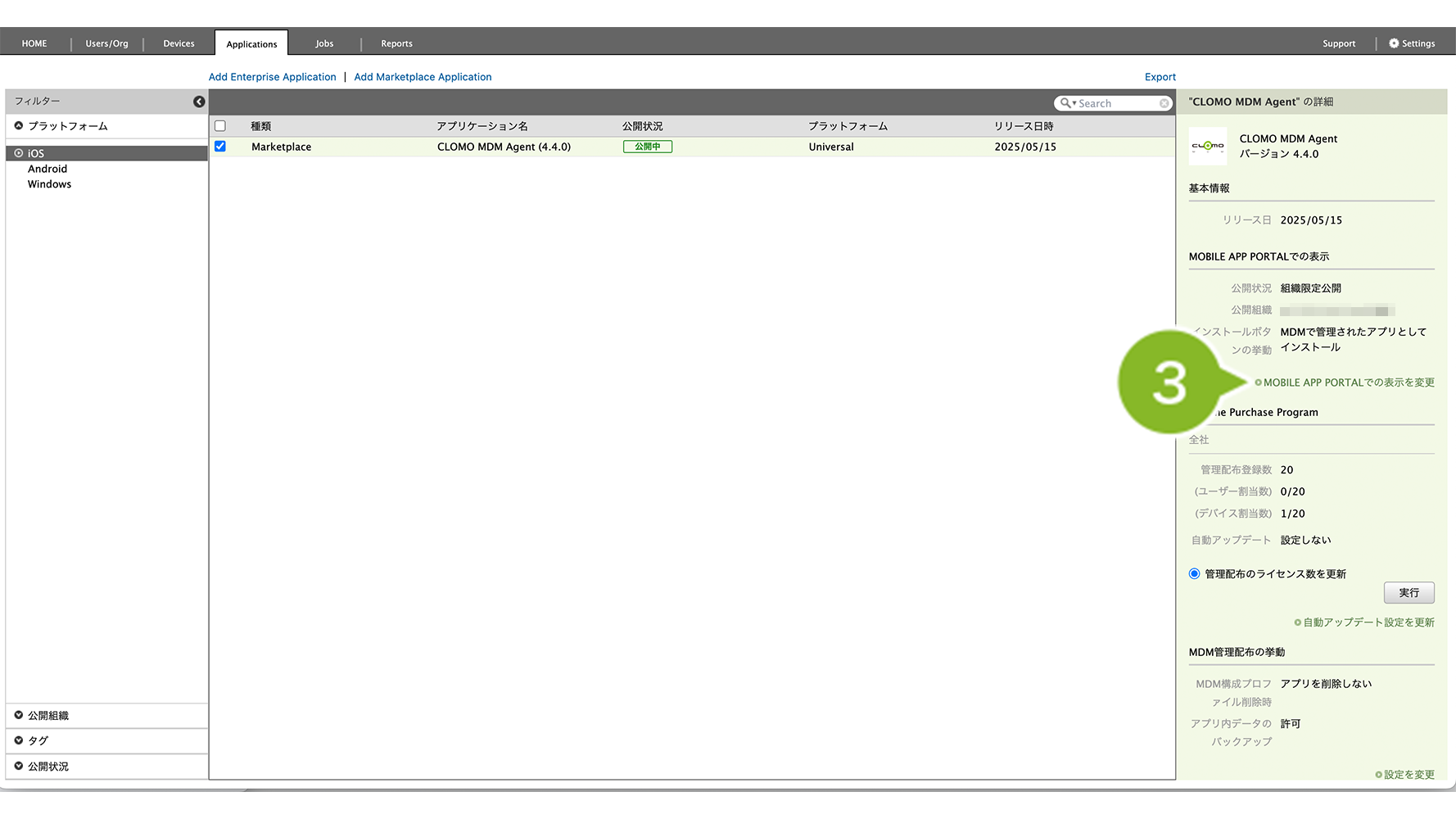 公開状況 | CLOMO MOBILE APP PORTAL 上にアプリケーションを表示させるかどうか設定できます。 | 「MOBILE APP PORTALでの表示を変更」について |