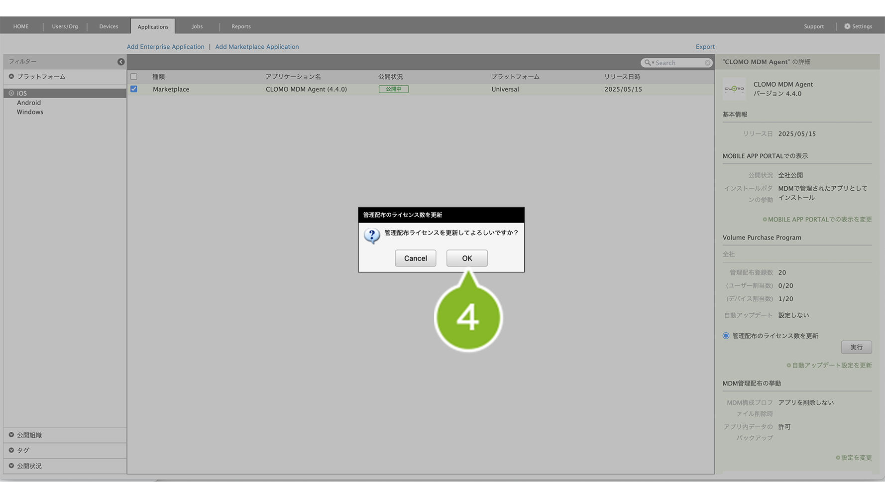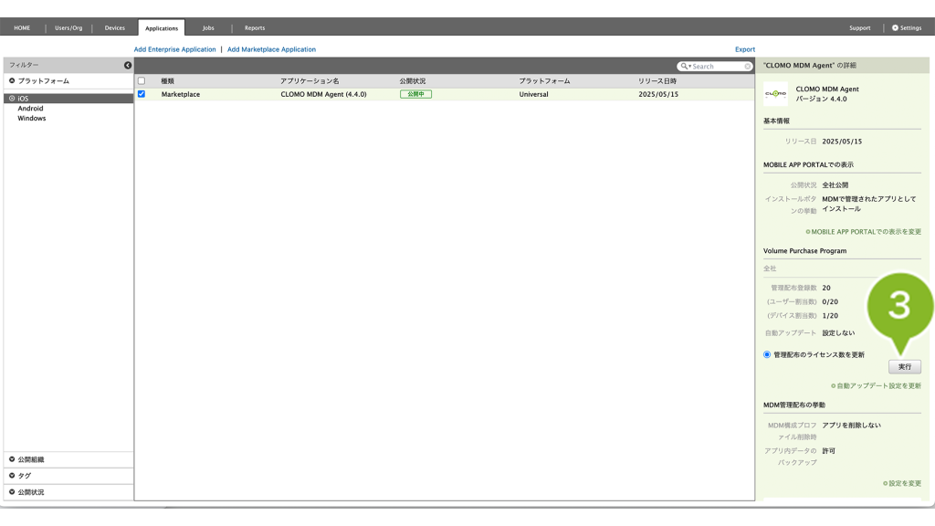 Applications 画面に登録する際に「ライセンス情報を同期する」ボタンをクリックして登録した場合は、VPP ライセンス数も同期されているため、本操作は不要です。