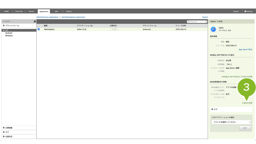 MDM構成プロファイルを削除時に強制アンインストール | デバイスが MDM 構成プロファイルを削除した際に、アプリケーションを強制アンインストールするかを設定できます。 | 「設定を変更」について |