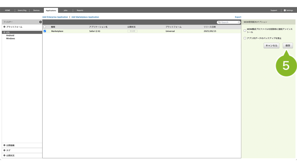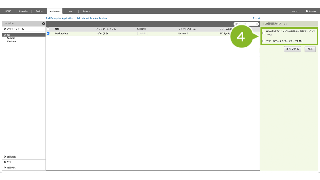 MDM構成プロファイルを削除時に強制アンインストール | チェックを入れると、デバイスが MDM 構成プロファイルを削除した際に、アプリケーションが強制アンインストールされます。 |