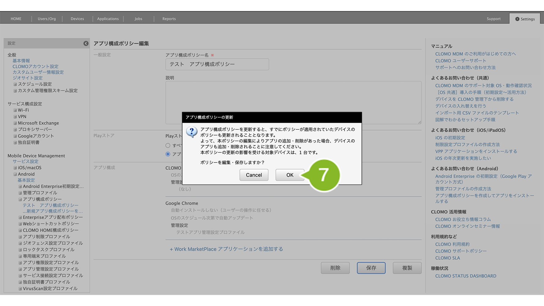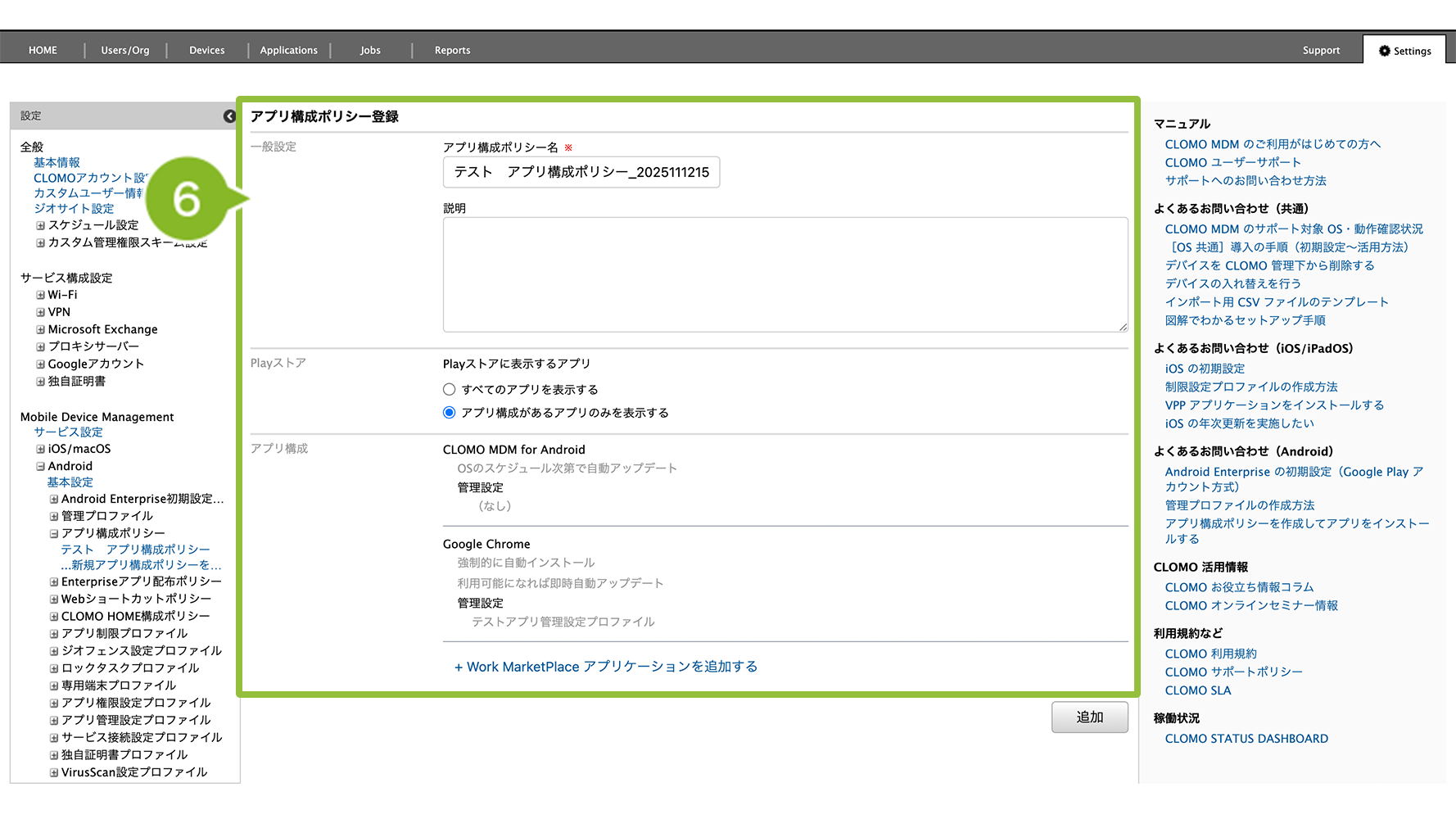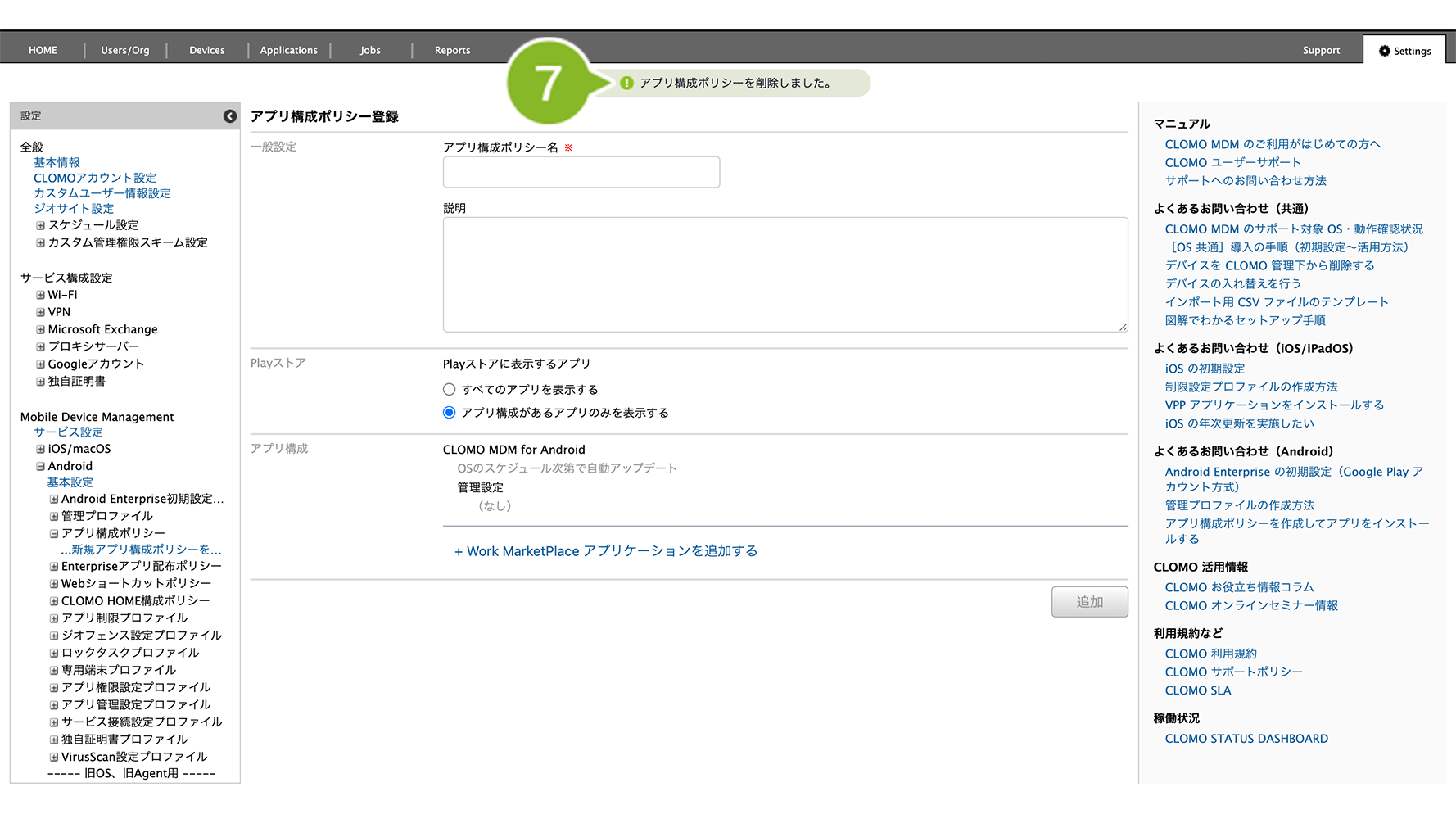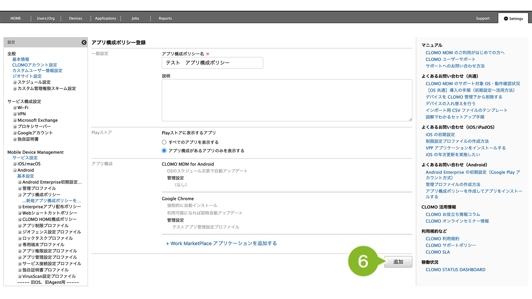 作成完了後、デバイスにポリシーを適用する方法は、インストールする(MarketPlace アプリケーション)をご参照ください。