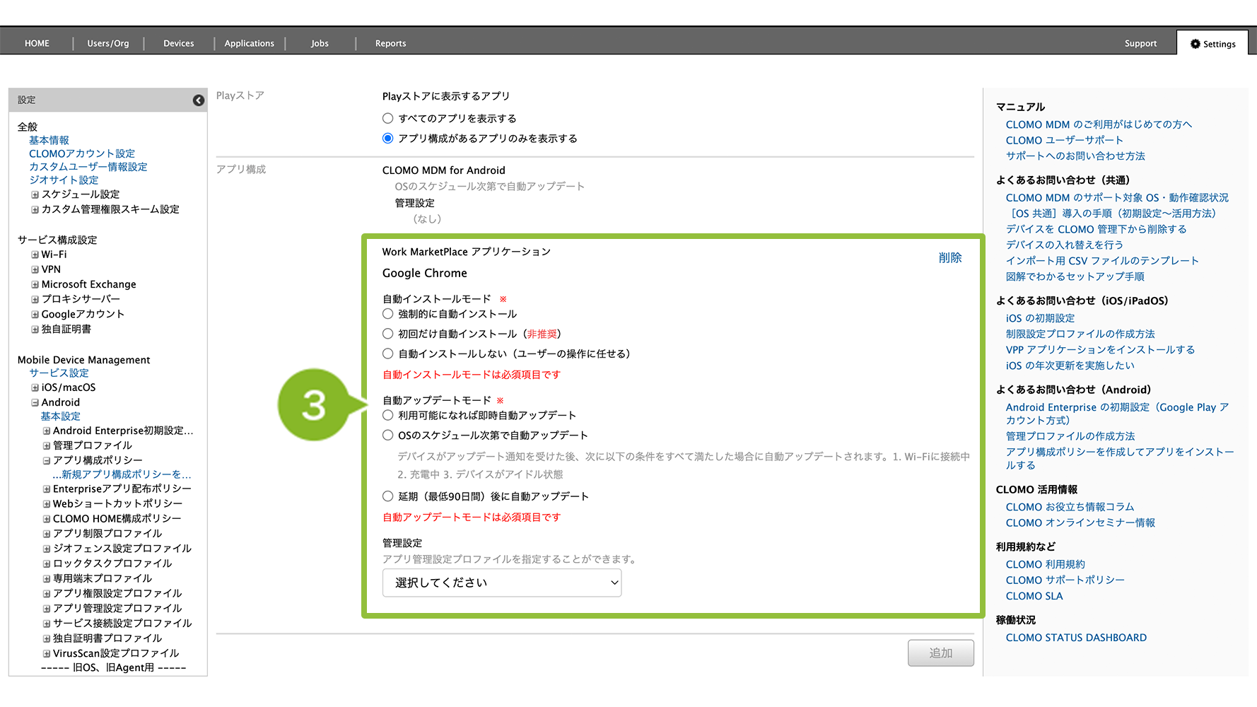 各アプリケーションごとに「自動インストールモード」や「自動アップデートモード」、作成済みの「アプリ管理設定プロファイル」の適用設定ができます。