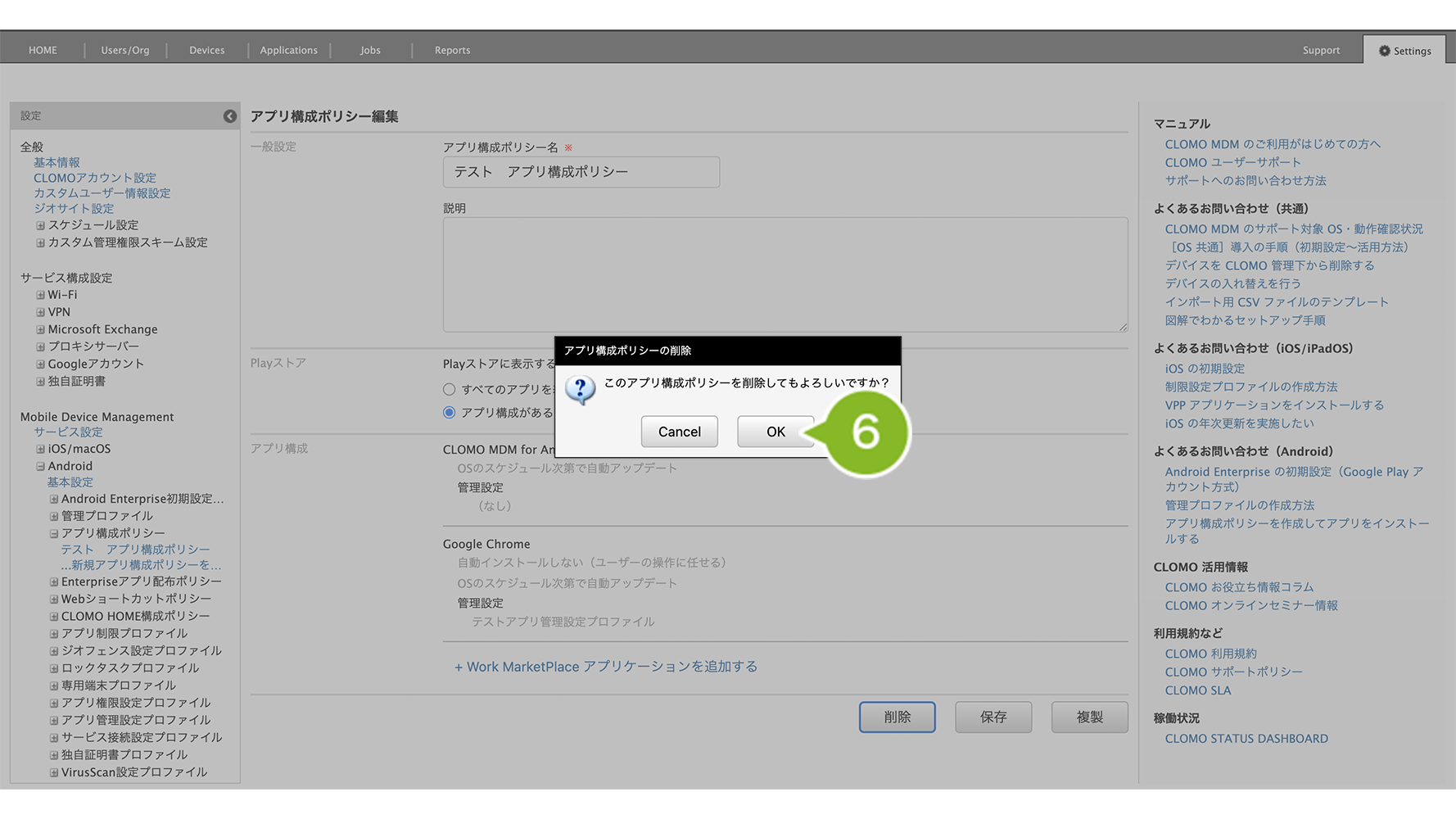 「アプリ構成ポリシー」の削除手順は、以下のとおりです。