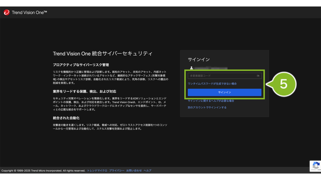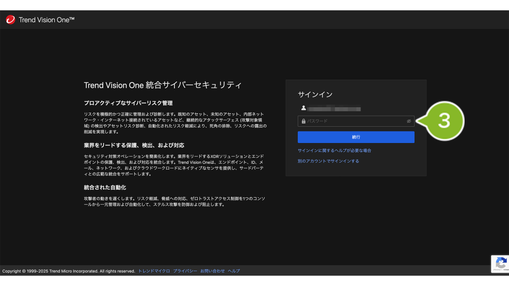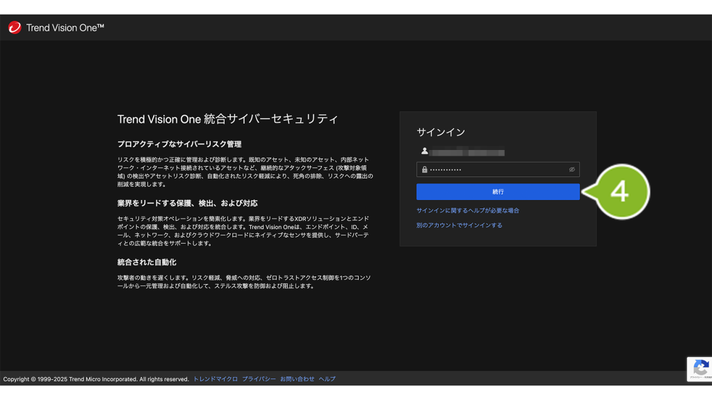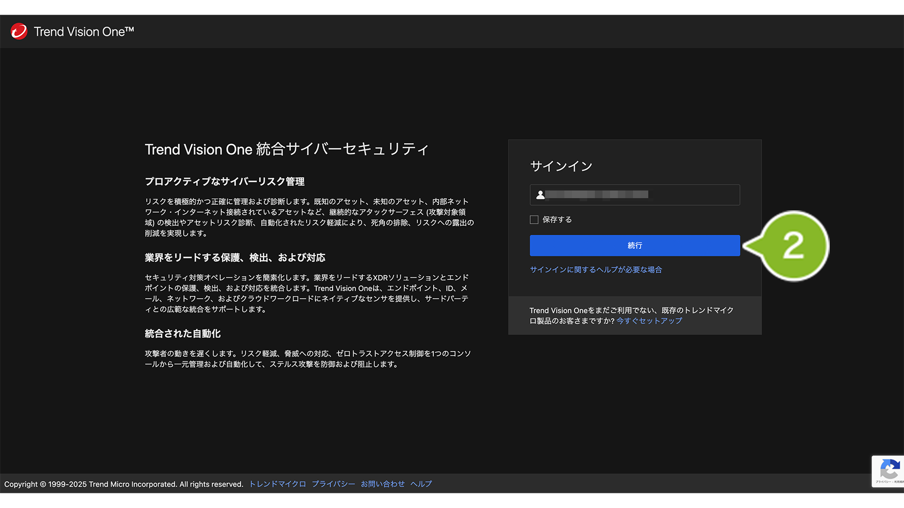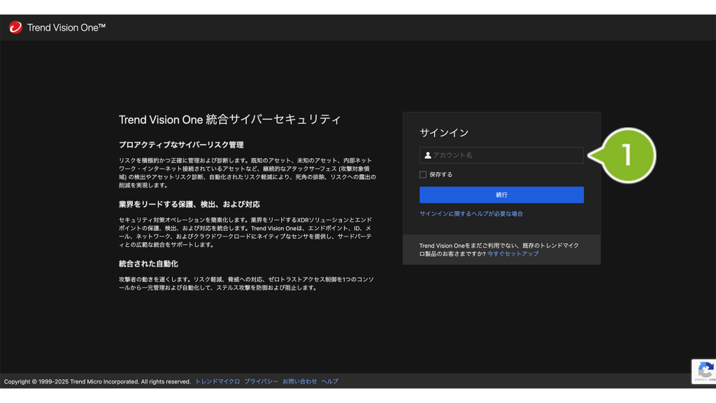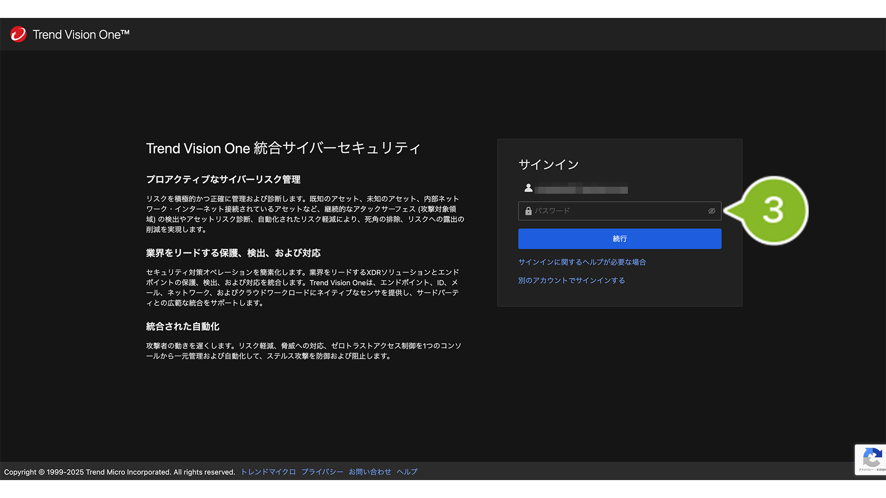 本ページの利用シーン・Trend Vision One 管理コンソールにログインする手順を知りたい場合 Trend Vision One 管理コンソールにログインする手順は、以下をご参照ください。 1. Trend Vision One のログイン画面にアクセスして、「アカウント名」を入力します。 2. 「続行」をクリックします。 3. 「パスワード」を入力します。 4.「続行」をクリックします。 5. 多要素認証を設定している場合は、「多要素確認コード」を入力して、サインインします。 6. ログインに成功すると、Trend Vision One コンソールが表示されます。