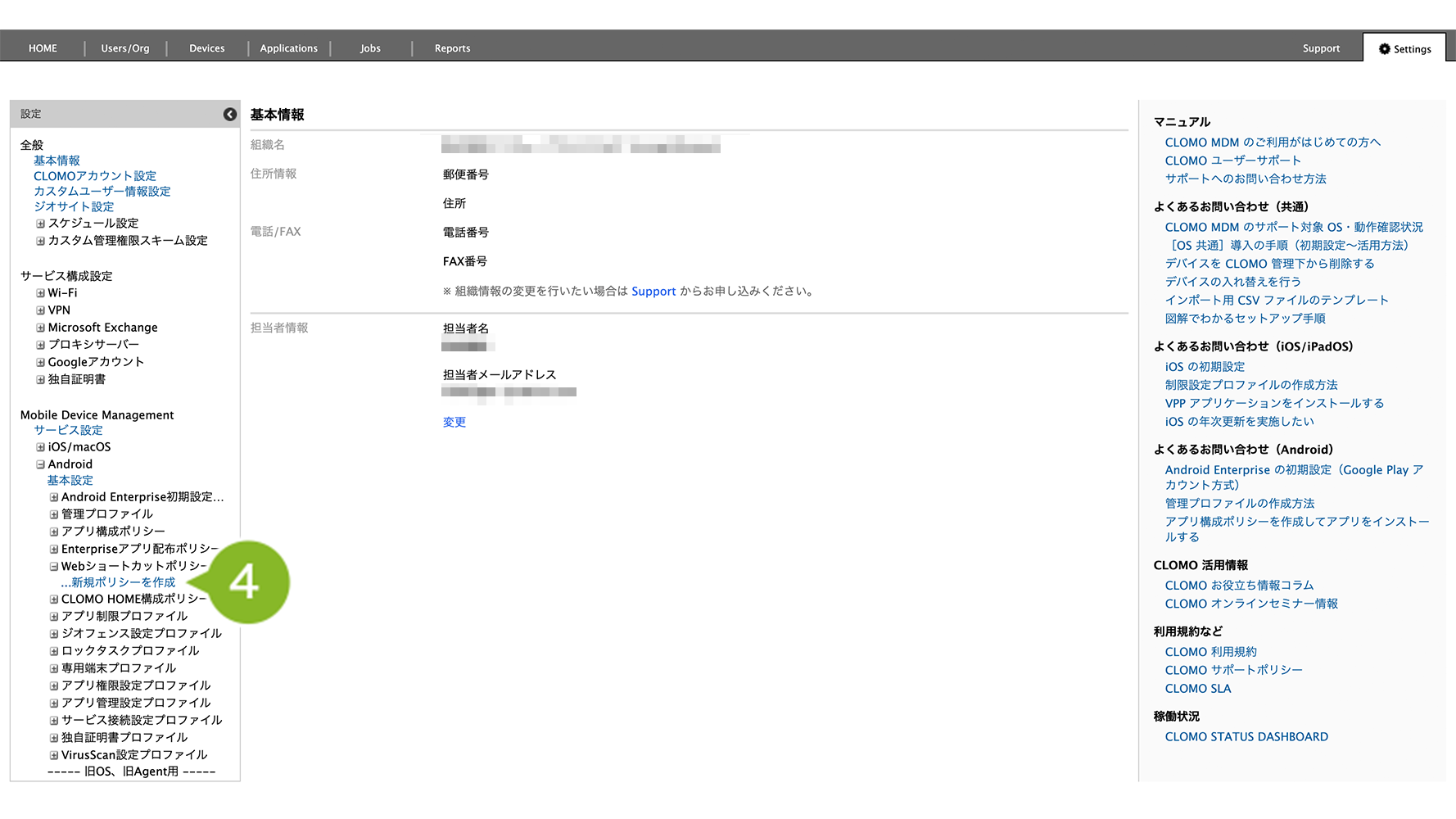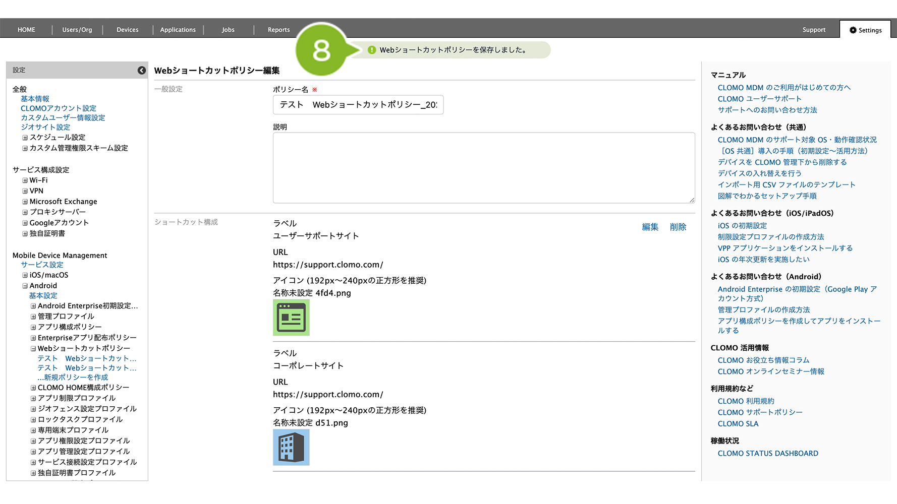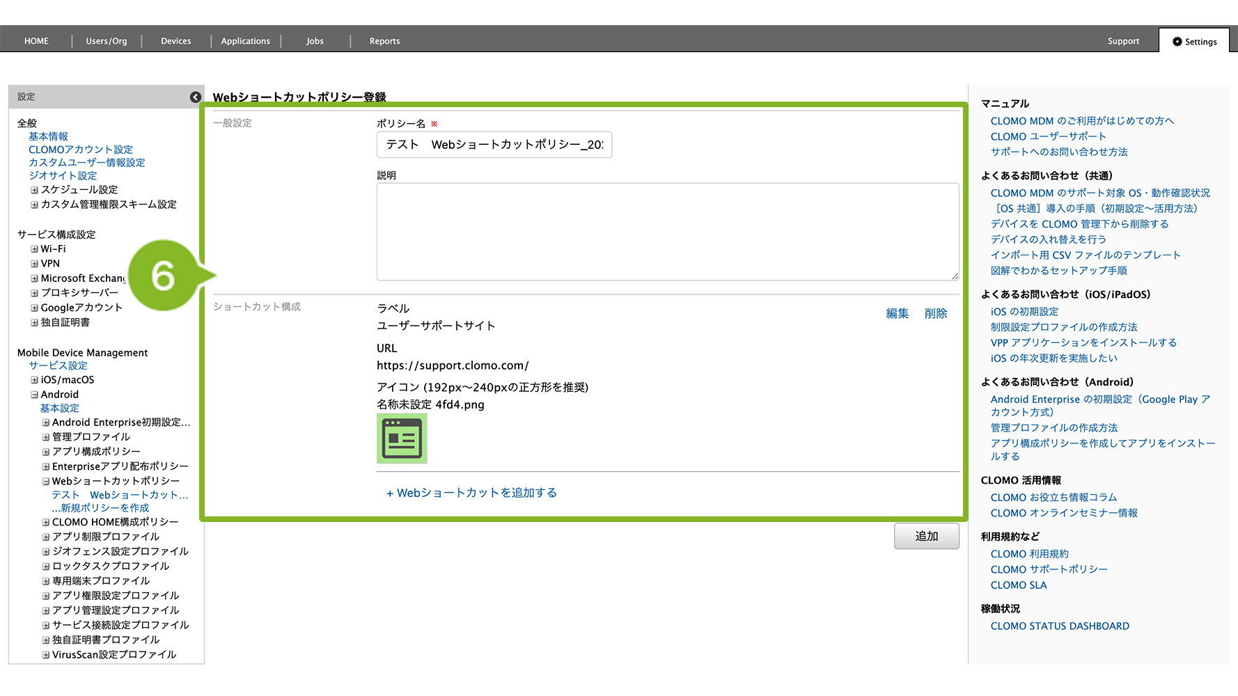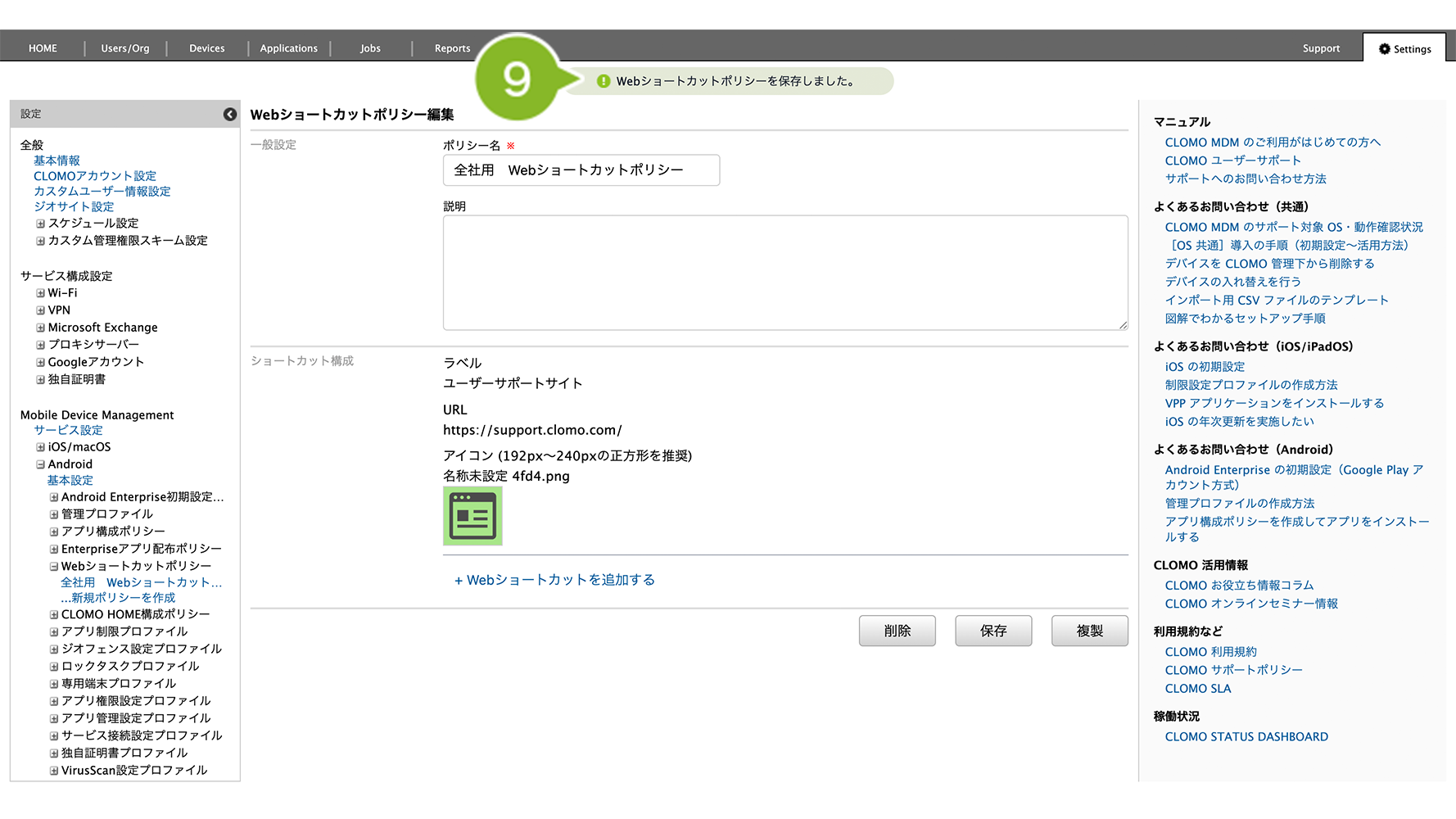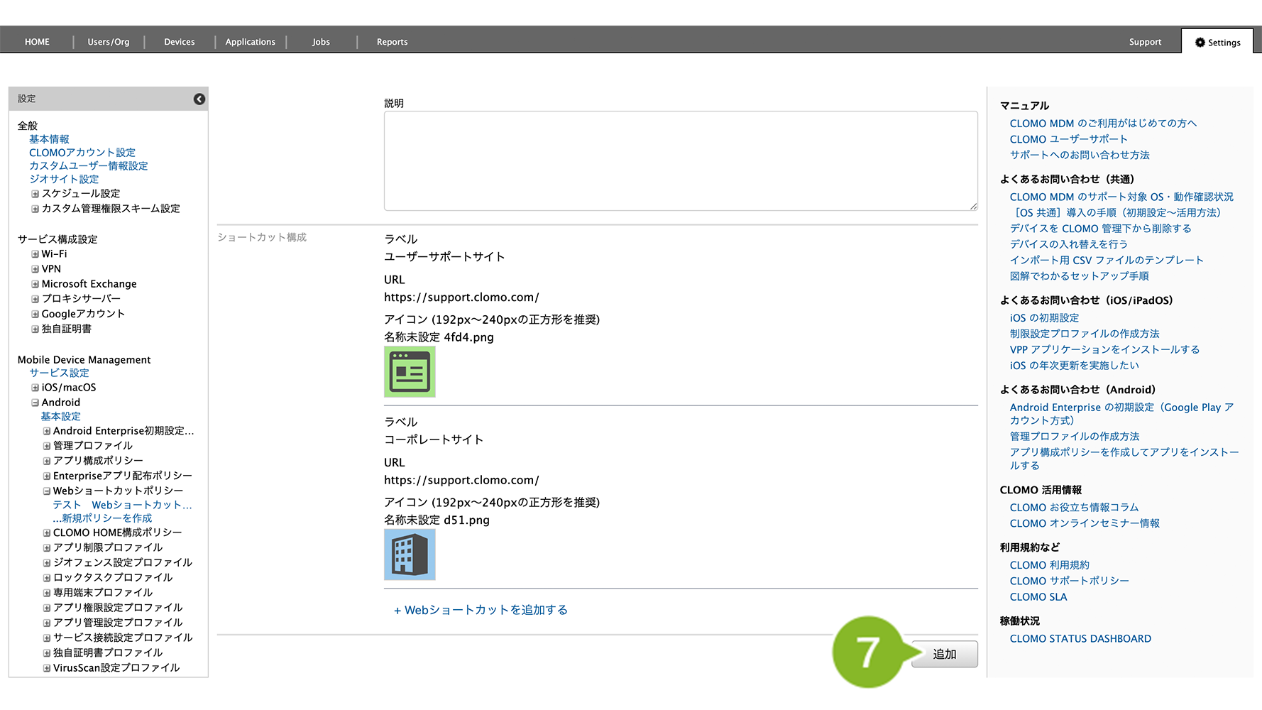 Web ショートカットポリシー適用後にホーム画面へ Web ショートカットを表示させるには、デバイス側で CLOMO MDM Agent for Android からの操作が必要です。操作方法については、Web ショートカットポリシー適用後のデバイス操作をご参照ください。