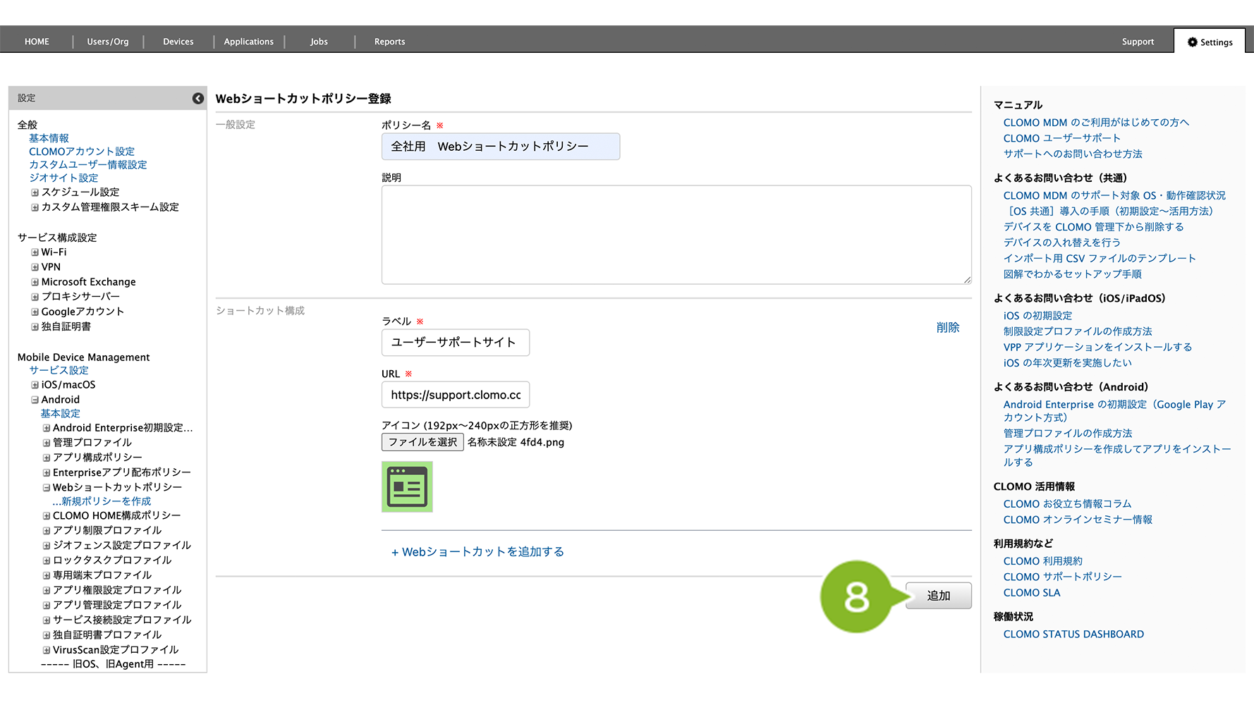 「Web ショートカットポリシー」は、特定の Web サイトをデバイスのホーム画面にショートカットとして追加できる機能です。