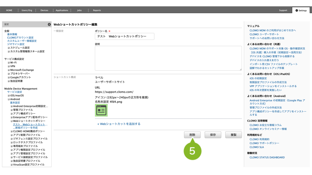 「Web ショートカットポリシー」の削除手順は、以下のとおりです。