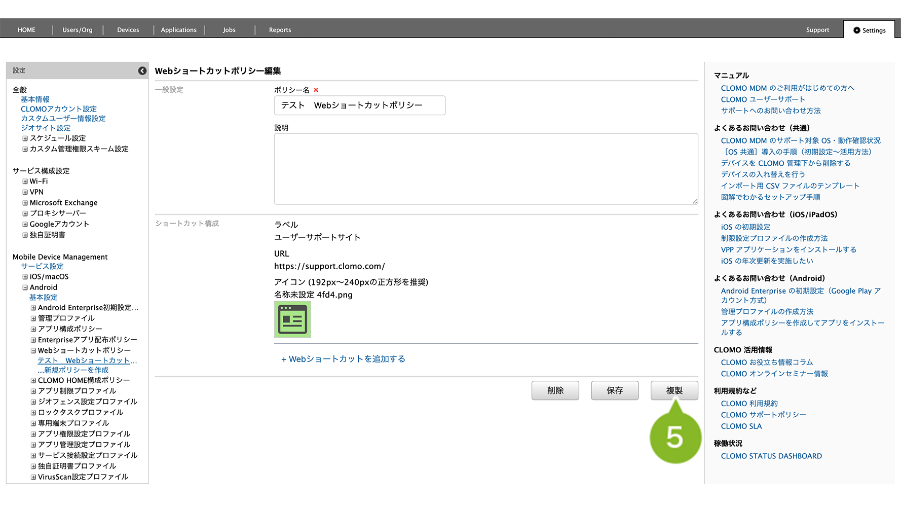 「Web ショートカットポリシー」の複製手順は、以下のとおりです。