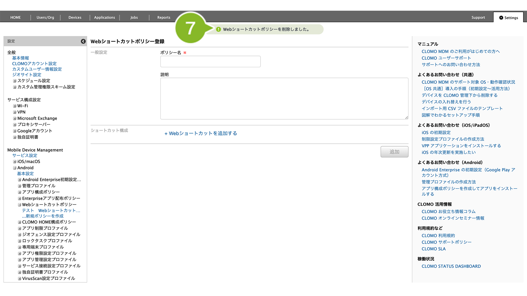 ショートカット構成の設定がないポリシーを新たに作成し、該当デバイスへ適用することで、デバイスから Web ショートカットを削除することができます。