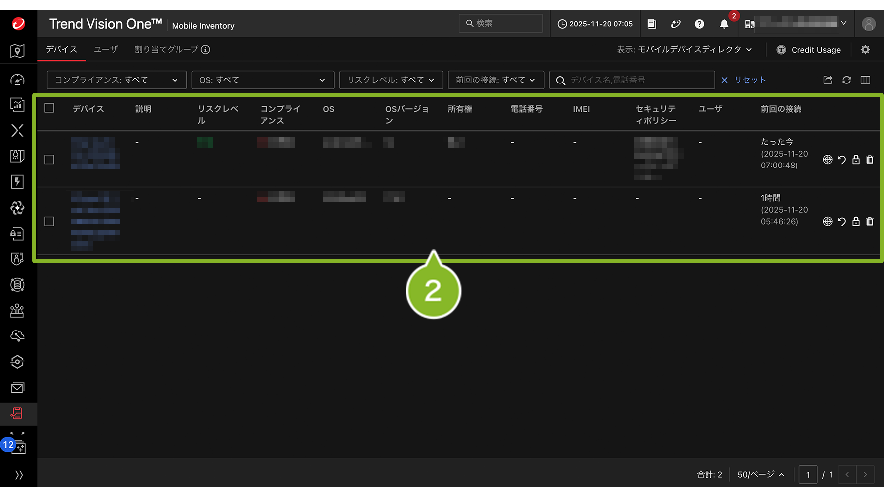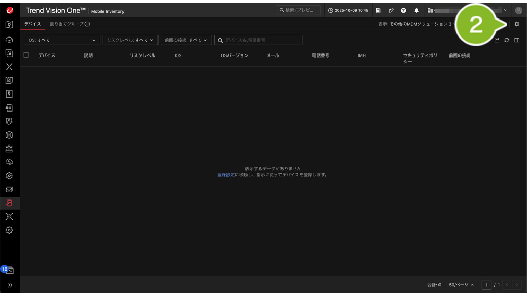 1. Trend Vision One 管理コンソールへログインして、MOBILE SECURITY アイコンから、[Mobile Inventory]をクリックします。