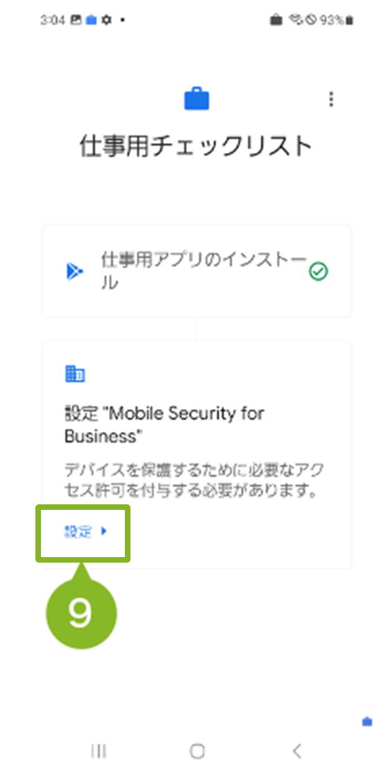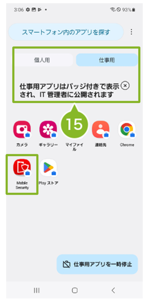 15. デバイスのメニュー画面で「個人用」と「仕事用」で表示が分かれていて、仕事用タブに「Mobile Security for Business」がインストールされていれば完了です。