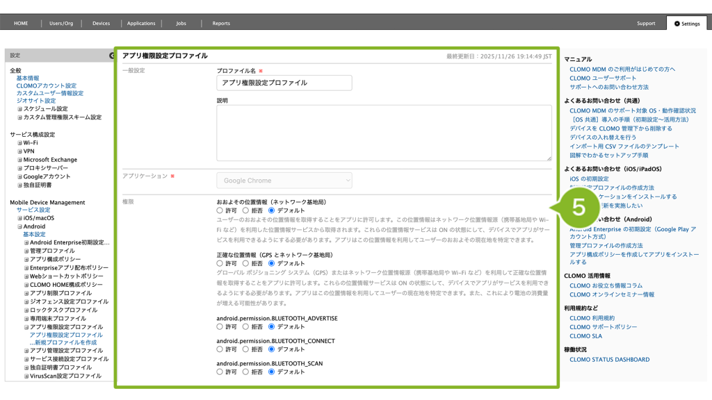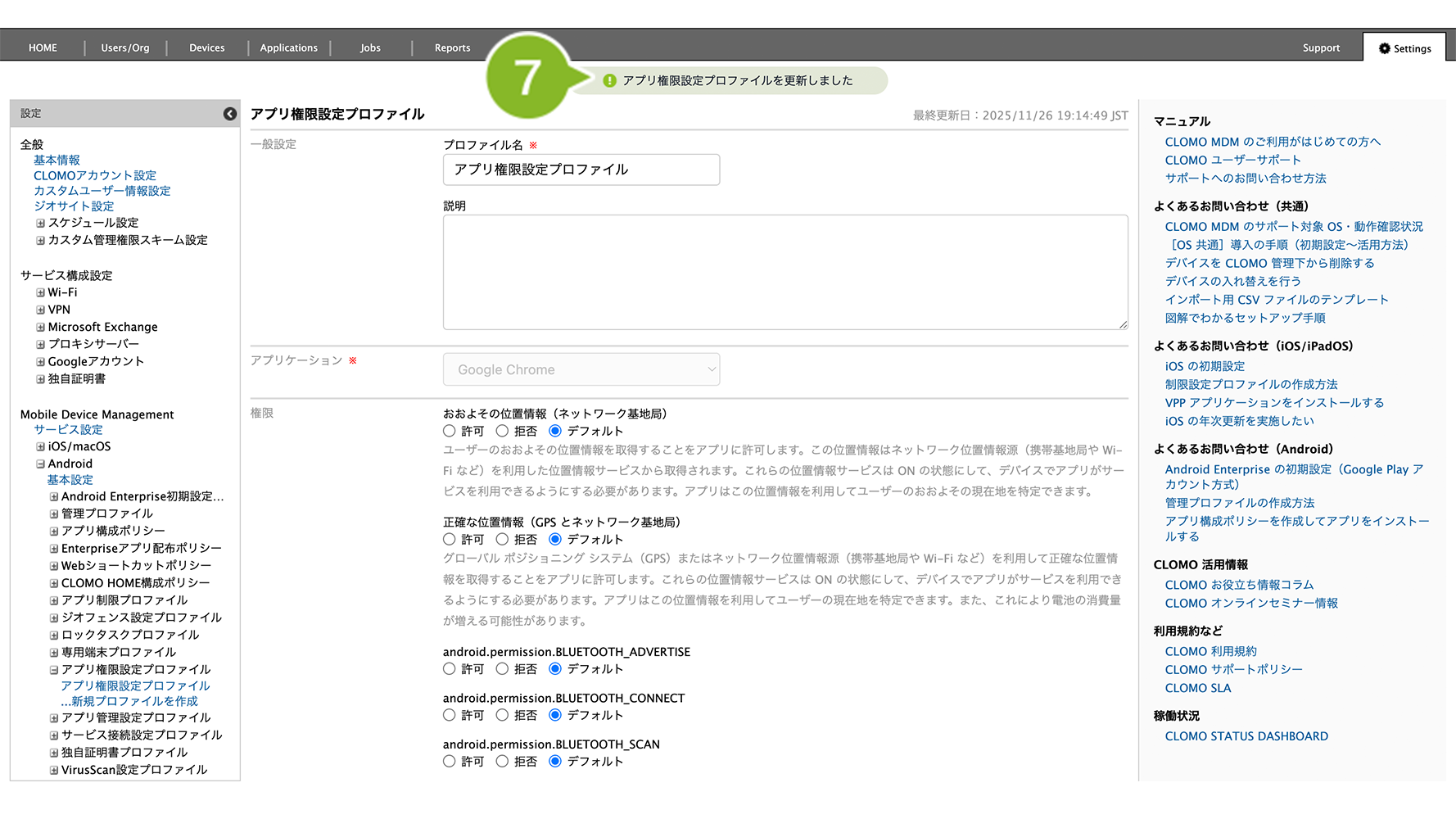 編集完了後、該当の「アプリ権限設定プロファイル」を個別適用しているデバイスには、プロファイルの再適用が必要です。