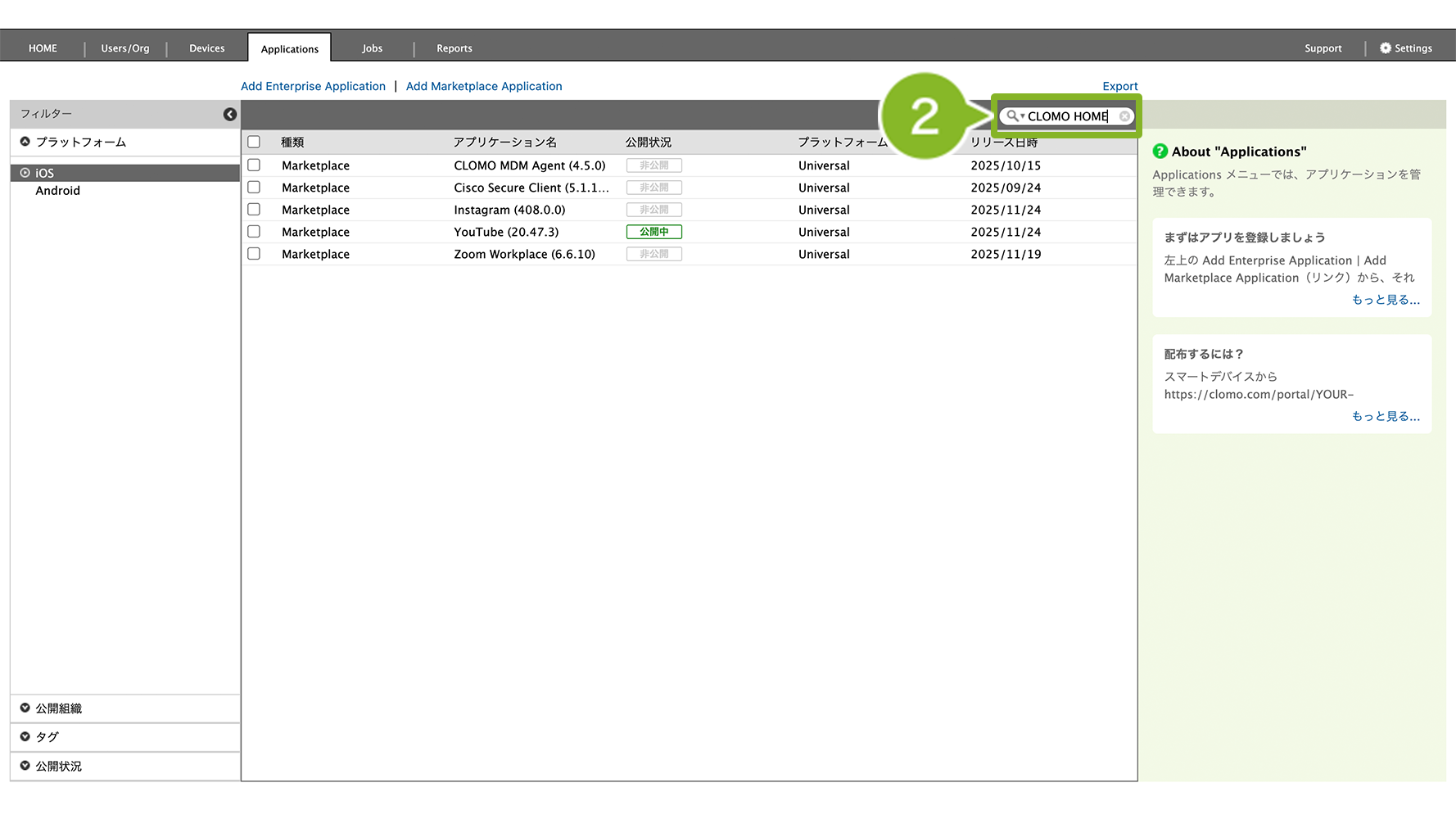 CLOMO MDM にアプリケーションを登録後、登録済みのアプリケーションを検索する方法は以下のとおりです。
