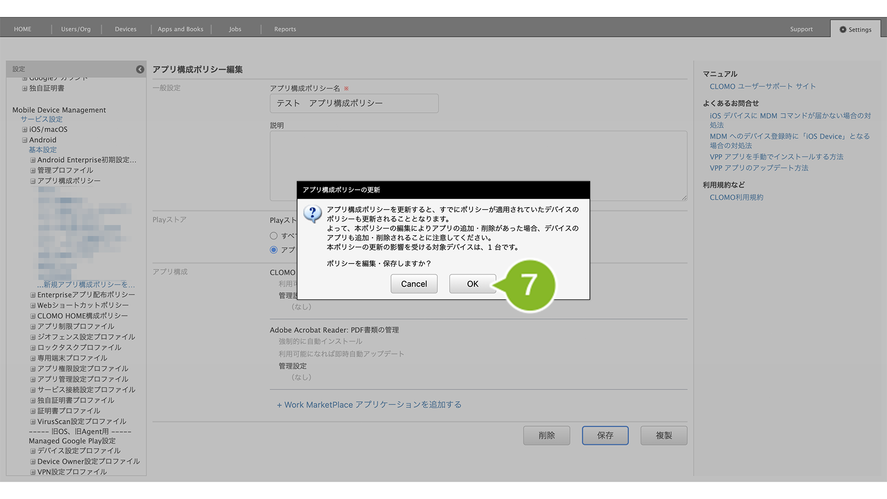7. デバイスに適用済みのアプリ構成ポリシーの場合、確認画面が表示されます。