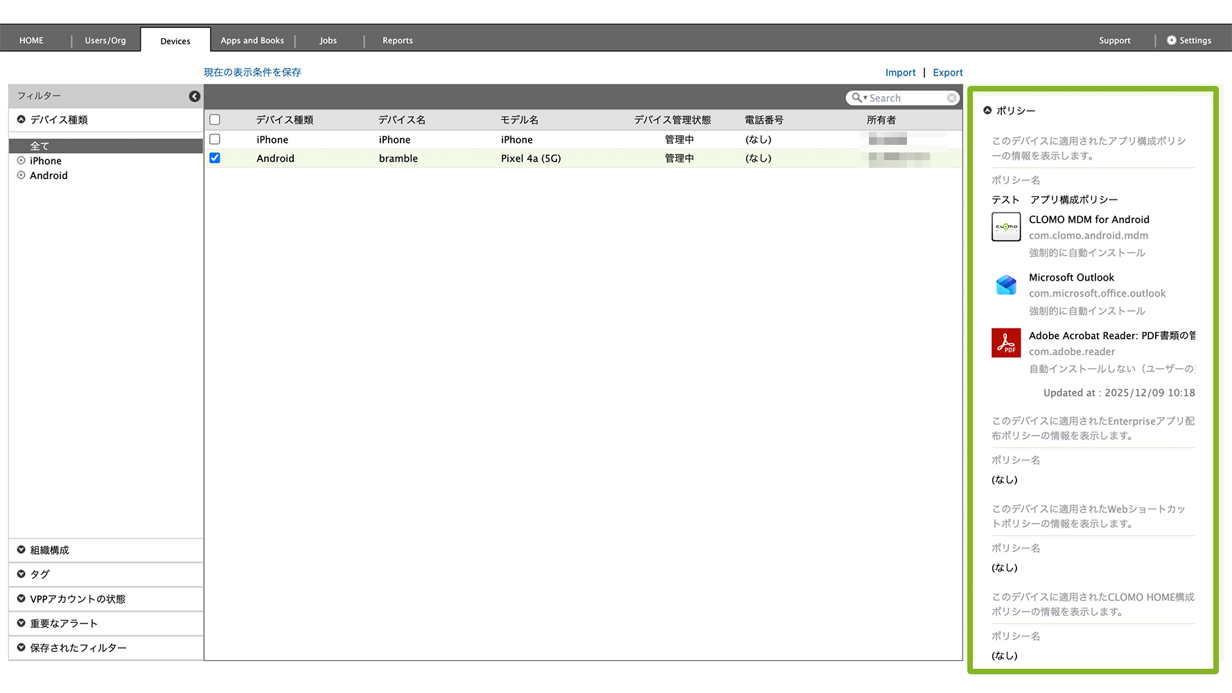 デバイスに適用済みのアプリ構成ポリシーを確認する場合は、Devices 画面から該当のデバイスを選択後、画面右側に表示される「ポリシー」欄から適用済みのポリシーを確認することができます。