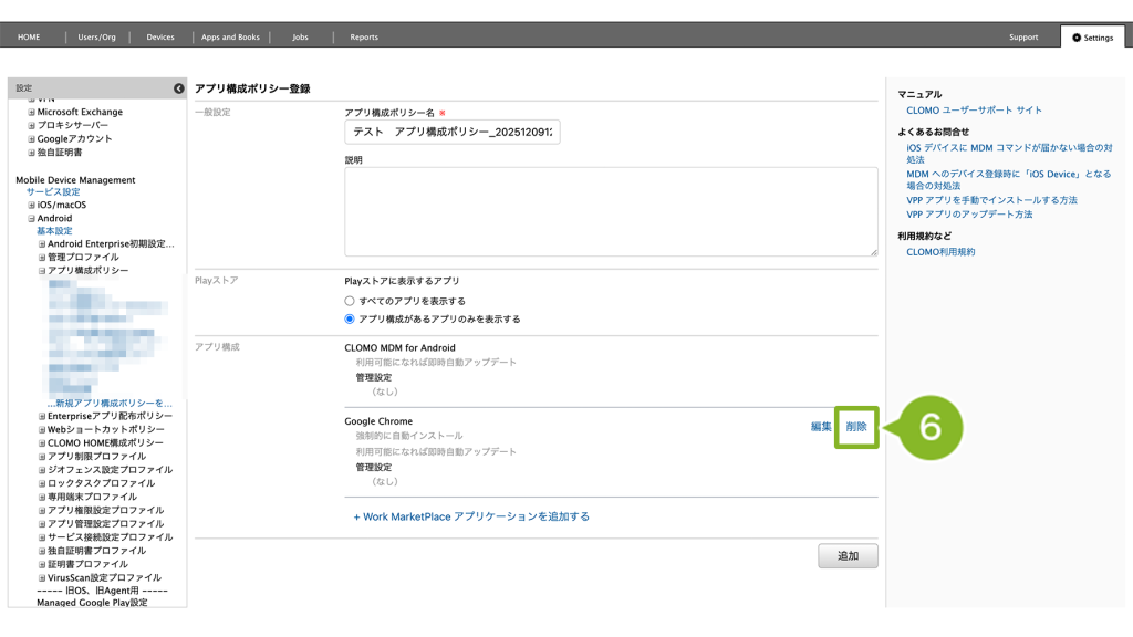 アプリ構成ポリシーが適用されている特定のデバイスでアプリケーションを削除する場合