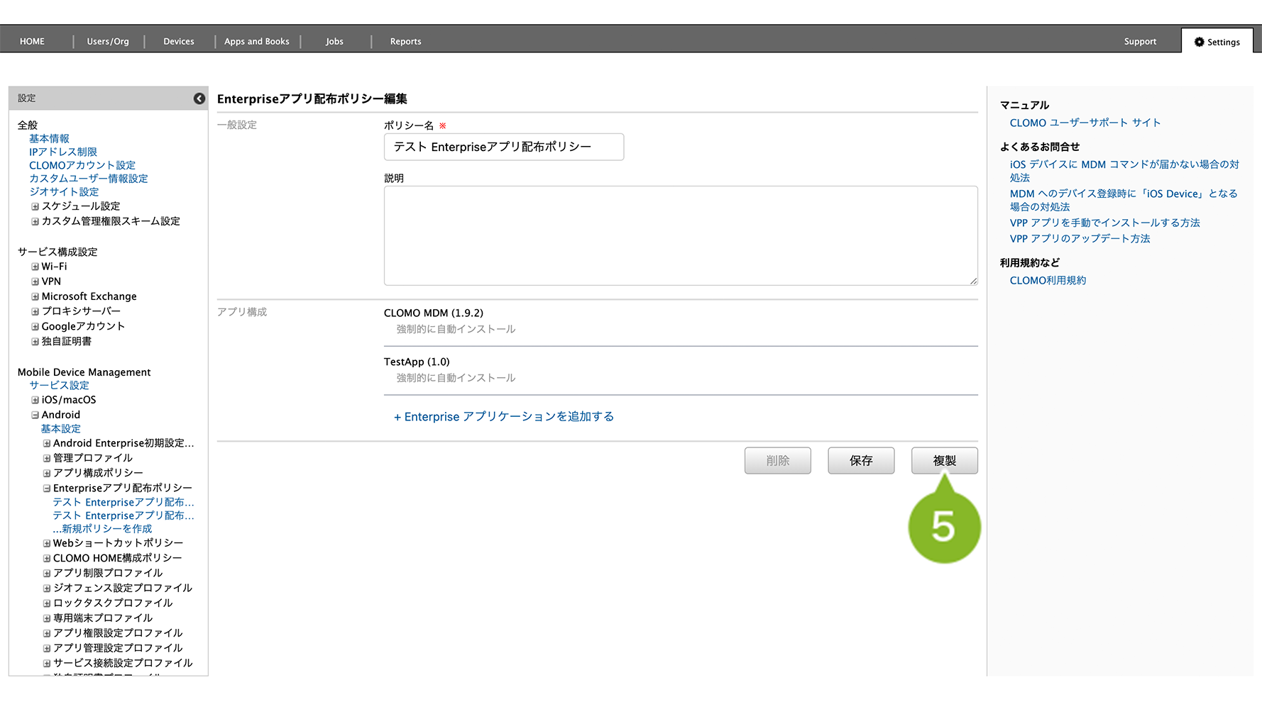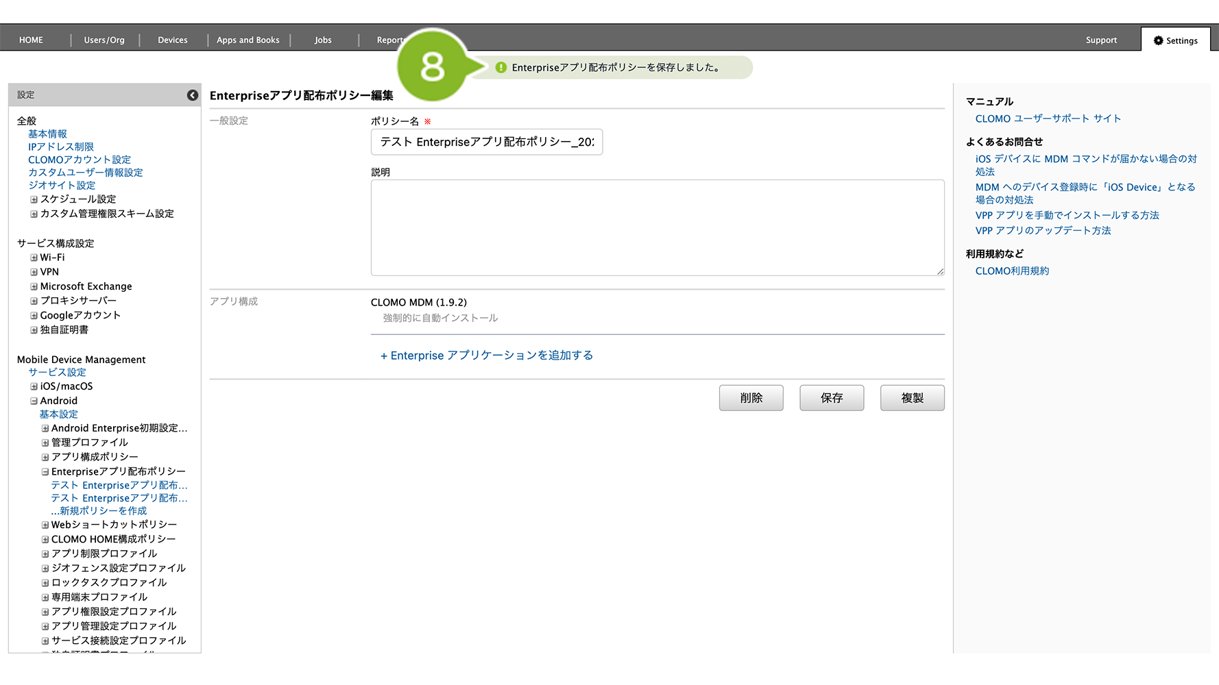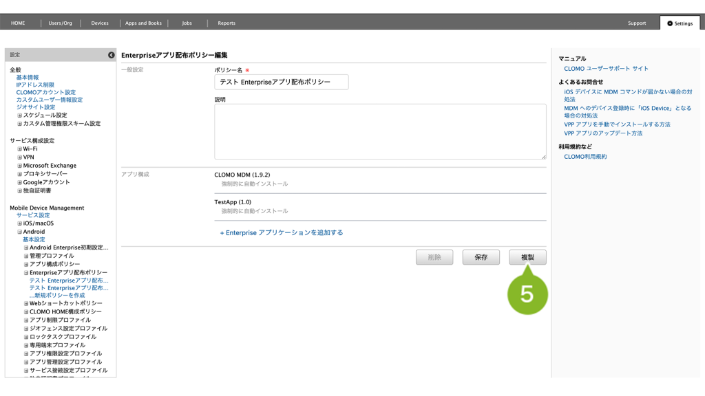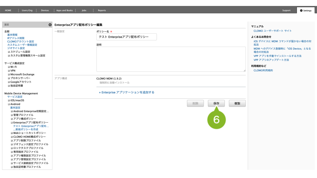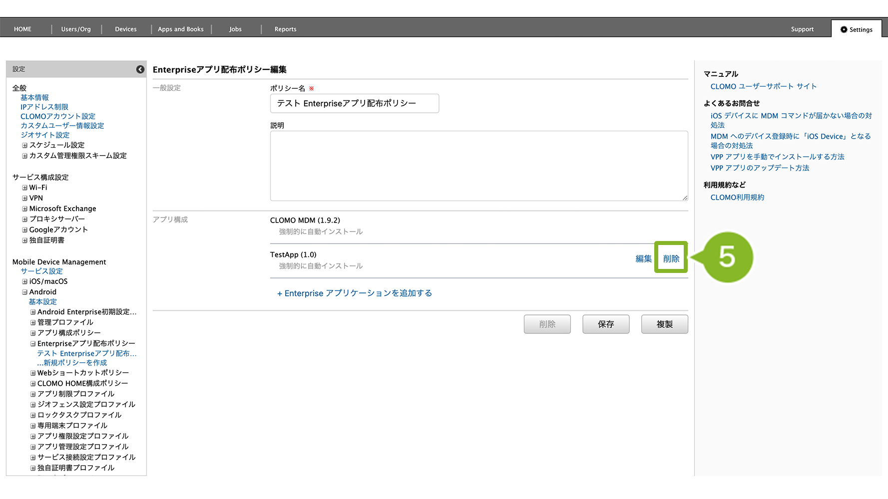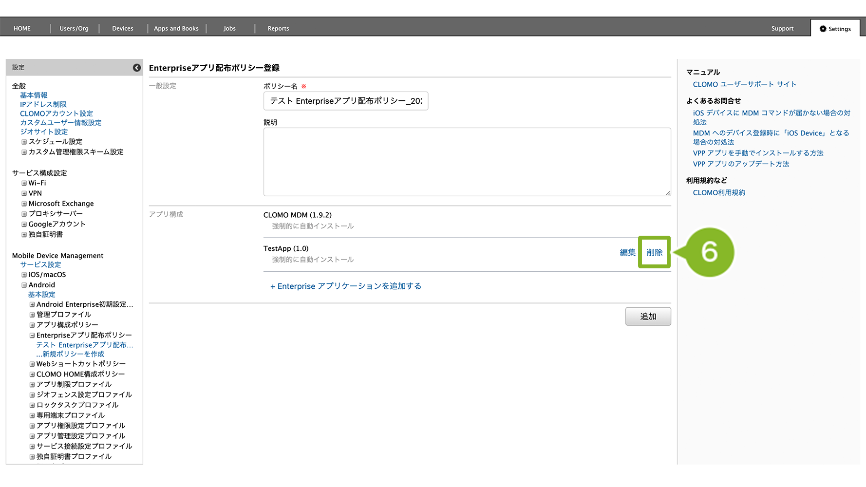 Enterprise アプリ配布ポリシーが適用されているデバイスでは、ポリシー自体を削除することはできません。