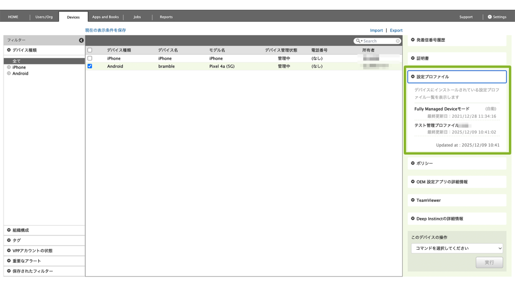 設定状況を確認するには、Devices 画面 から対象のデバイスを選択し、画面右側の 「設定プロファイル」欄 に表示されている適用済みの管理プロファイルを確認します。
