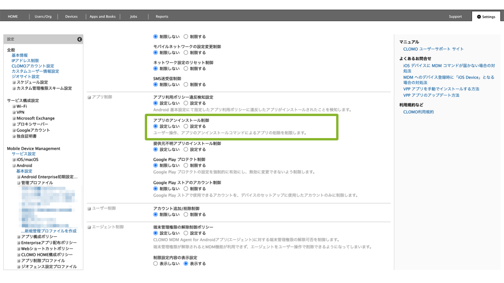 複製したプロファイル内の 「アプリ制御」 項目にある、 「アプリのアンインストール制御」 を 「設定しない」 に変更し、保存します。