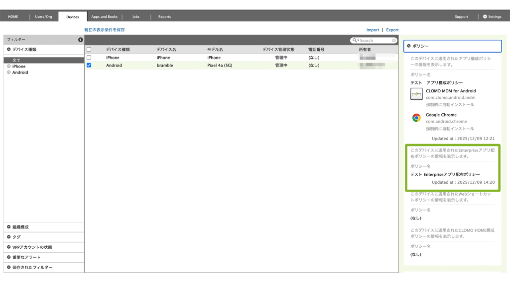 デバイスに適用済みの Enterprise アプリ配布ポリシーを確認する場合は、「Devices」画面から該当のデバイスを選択後、画面右側に表示されるポリシー欄から、適用済みのポリシーを確認できます。