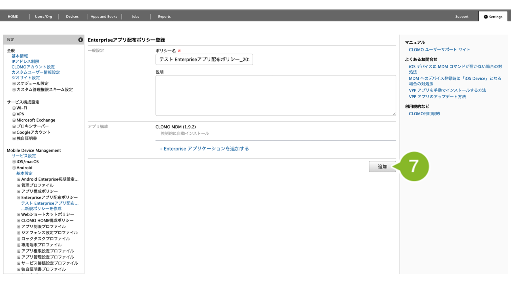 ポリシー作成後、デバイスに作成した Enterprise アプリ配布ポリシーを適用します。詳しくは、インストールする(Enterprise アプリケーション)をご参照ください。