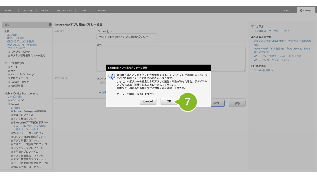 7. デバイスに適用済みの Enterprise アプリ配布ポリシーの場合、確認画面が表示されます。