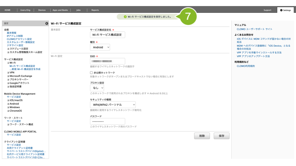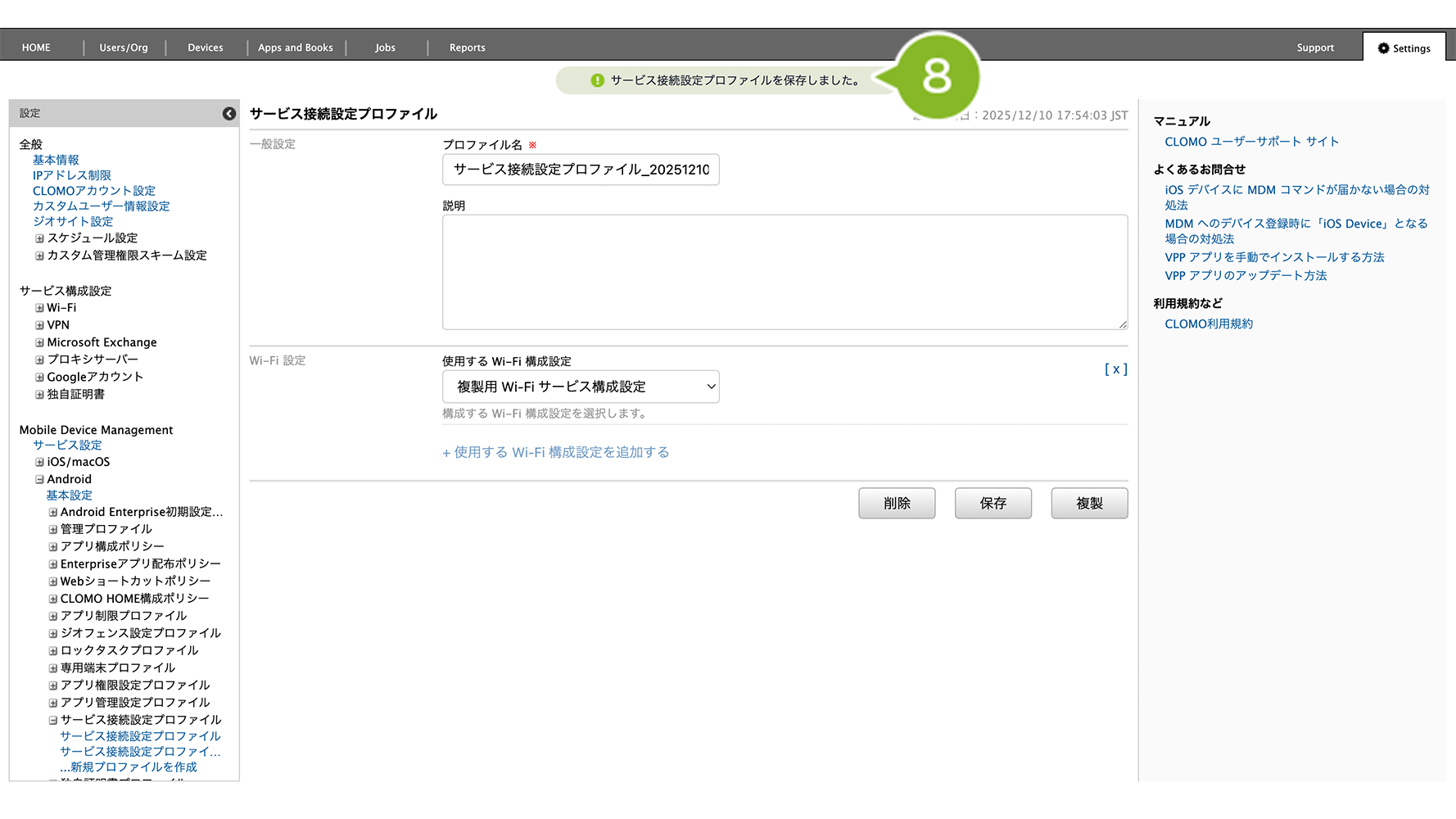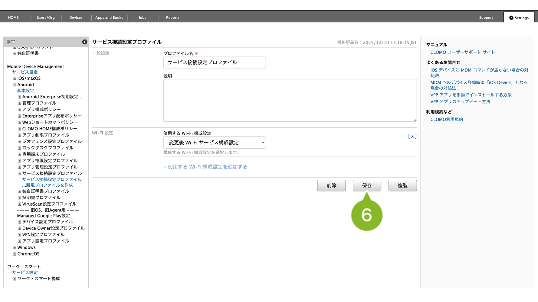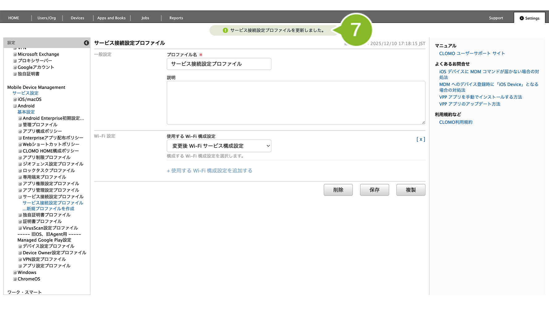 編集完了後、該当の「サービス接続設定プロファイル」を個別適用しているデバイスには、プロファイルの再適用が必要です。