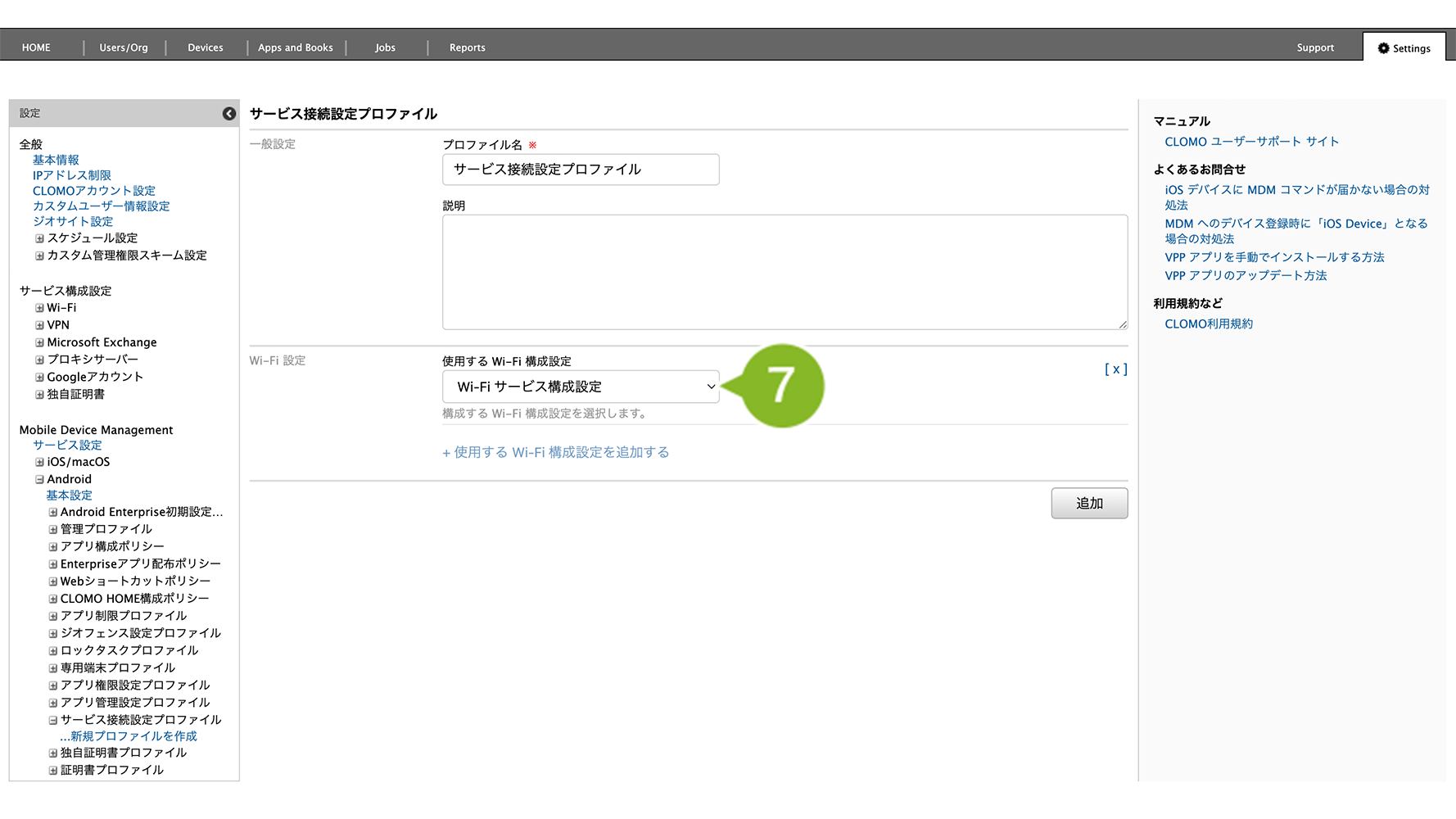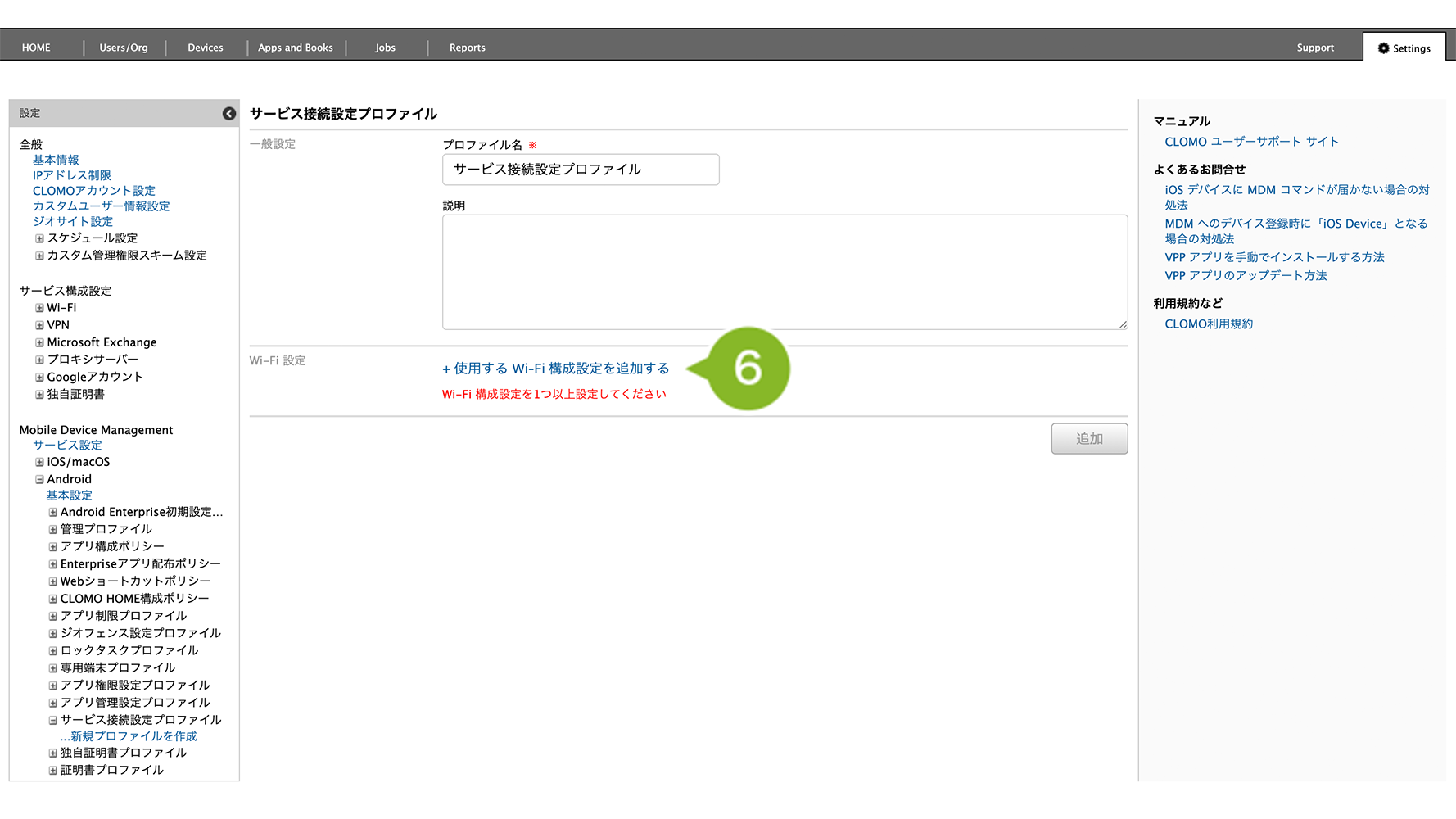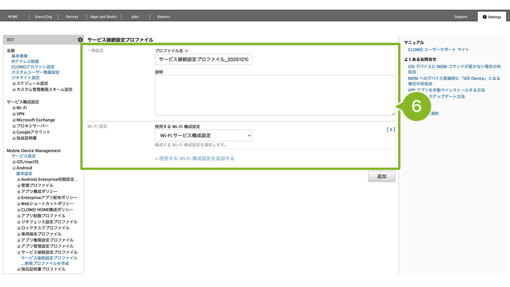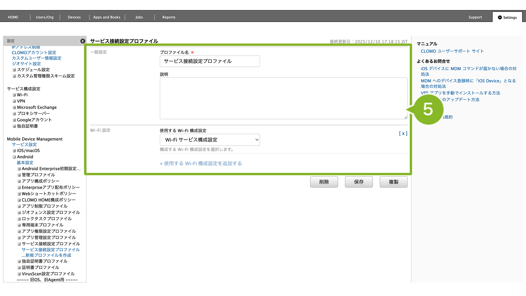 編集完了後、該当の「サービス接続設定プロファイル」を個別適用しているデバイスには、プロファイルの再適用が必要です。