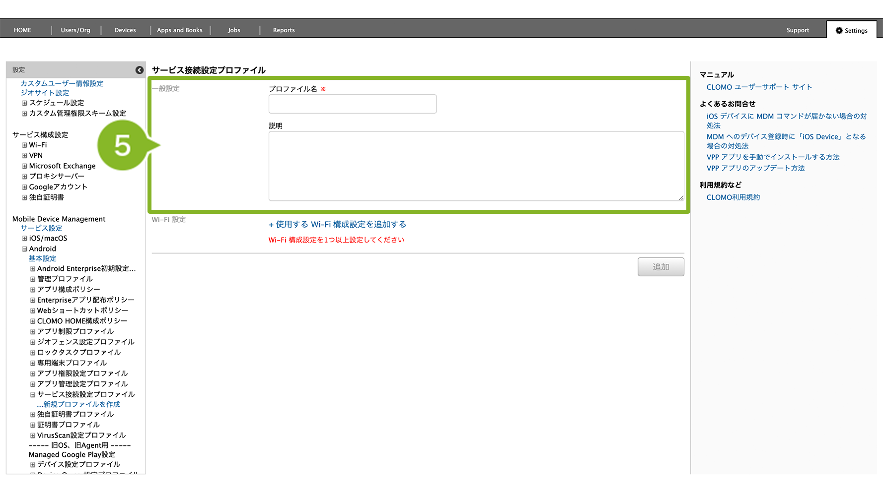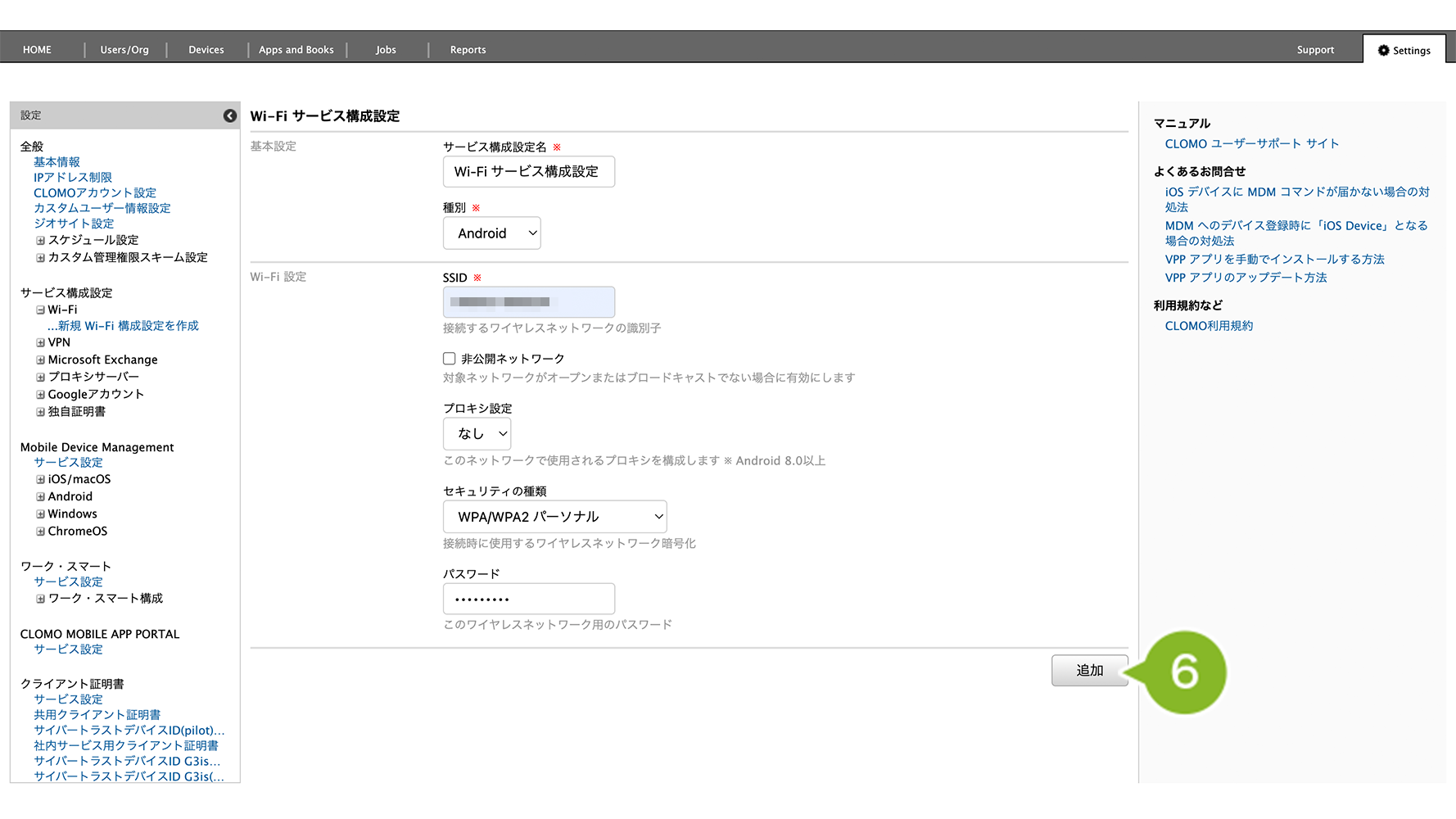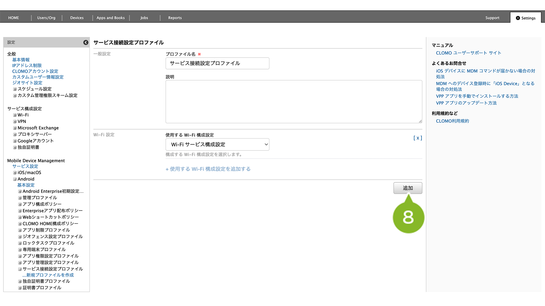 編集完了後、該当の「サービス接続設定プロファイル」を個別適用しているデバイスには、プロファイルの再適用が必要です。