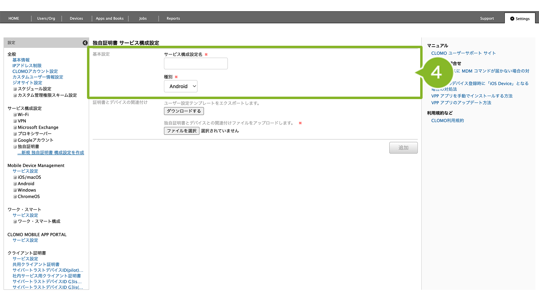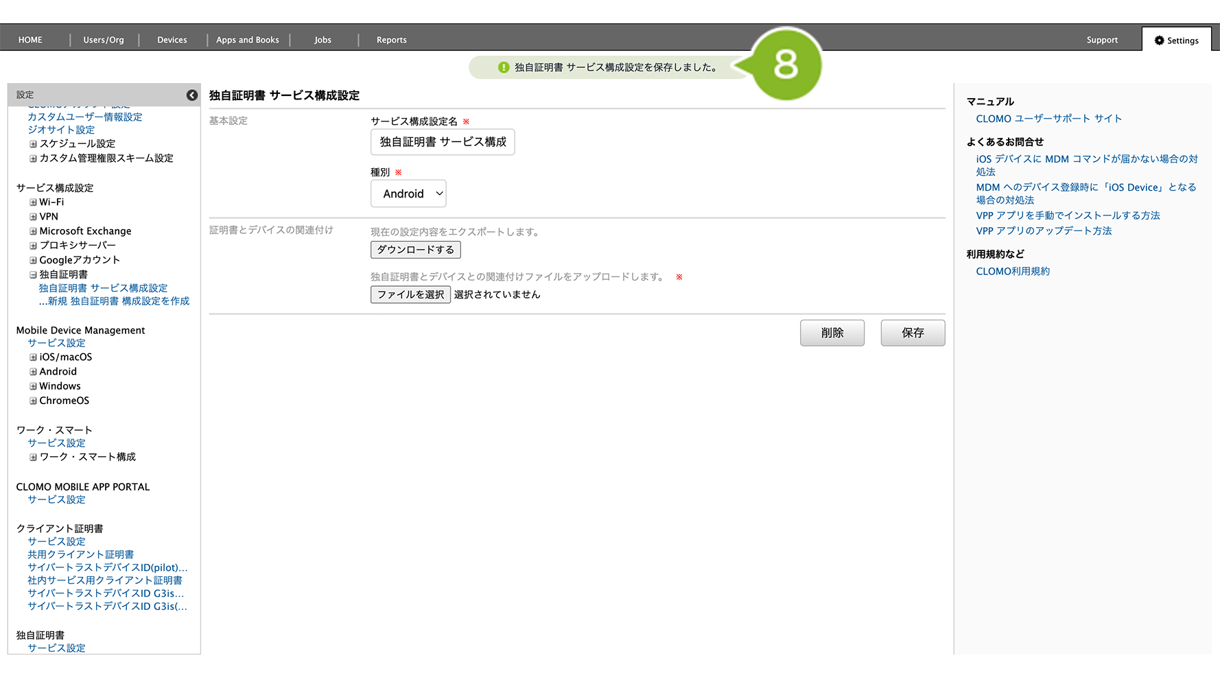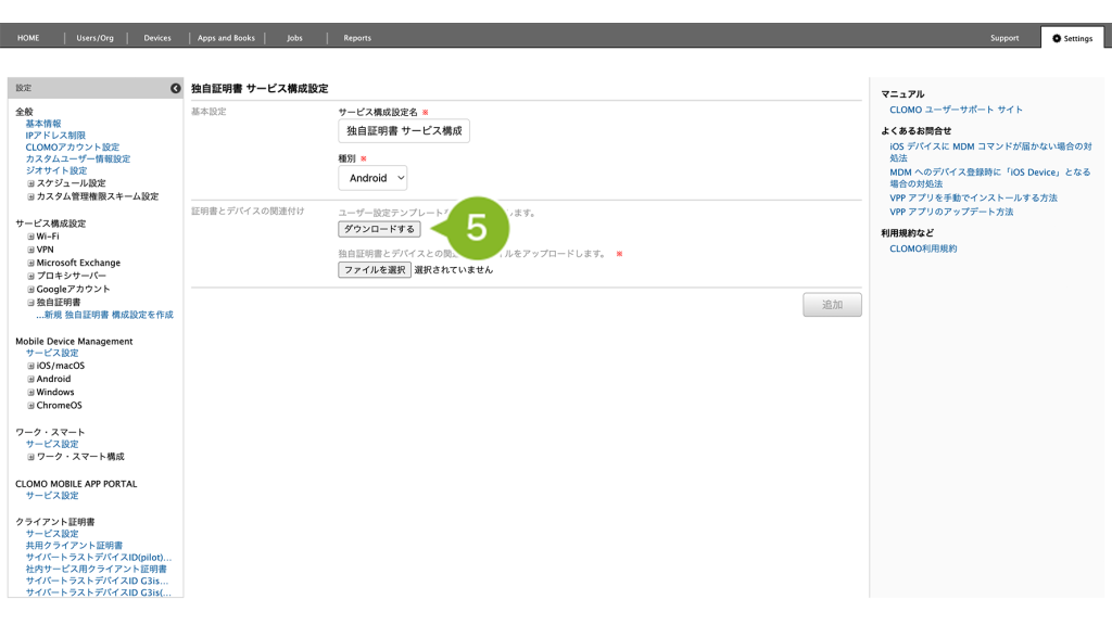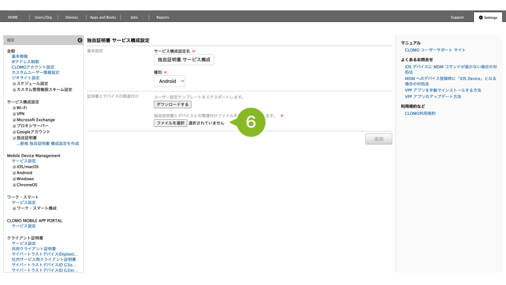 | 信頼できる証明書 | サービス構成設定「独自証明書」で指定したファイルをアップロードします。cer ファイル、pem ファイルに対応しています。 |