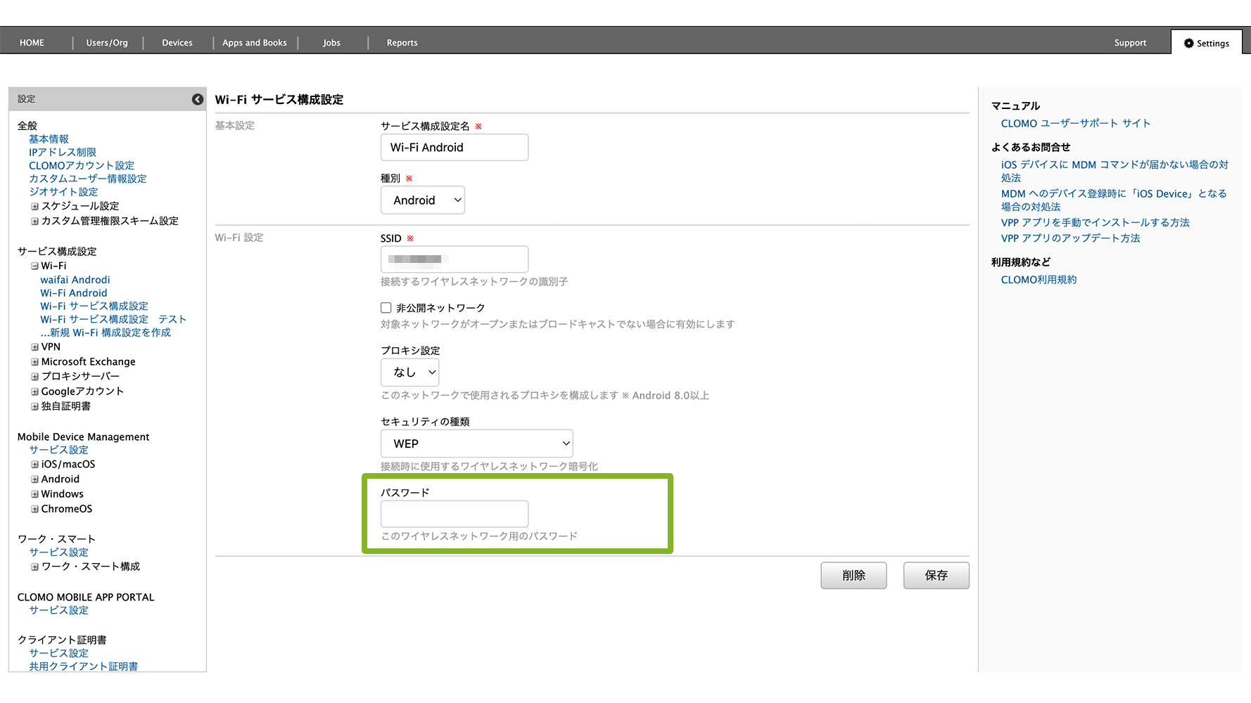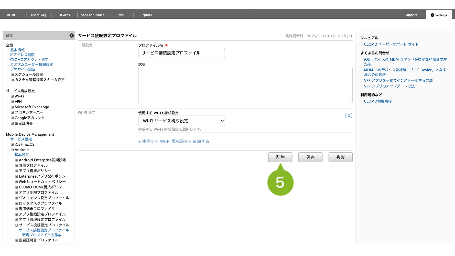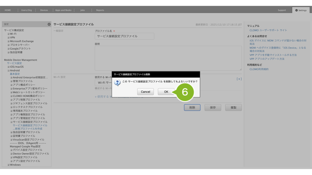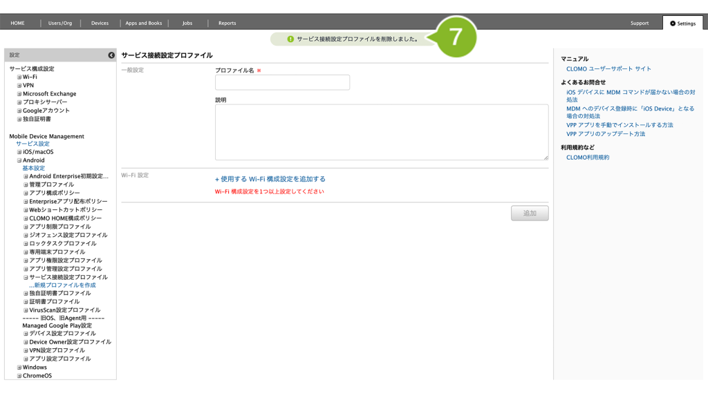 「サービス接続設定プロファイル」を個別適用しているデバイスには、削除コマンドの実行が必要です。