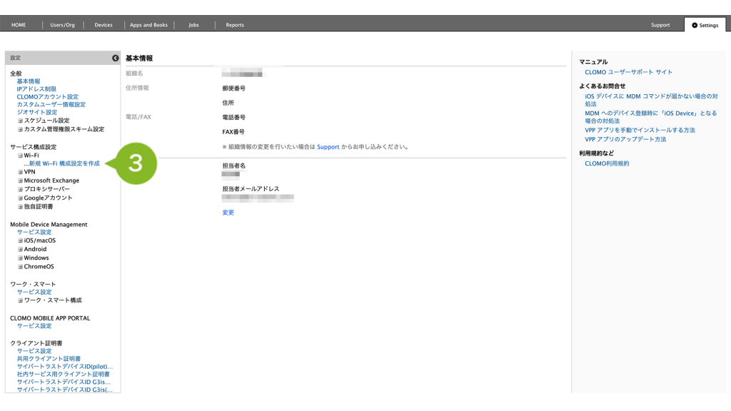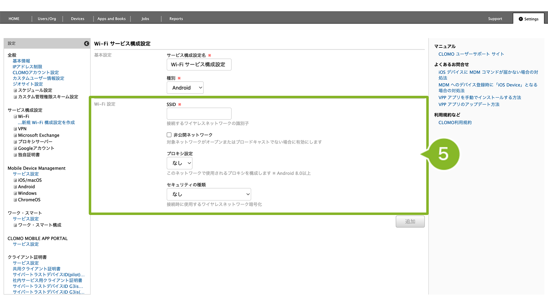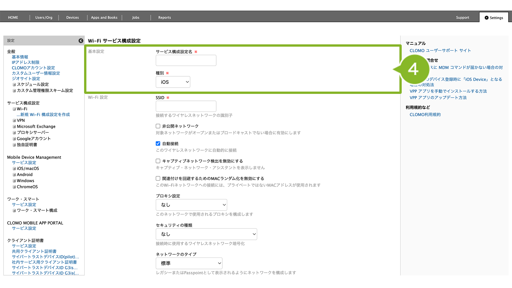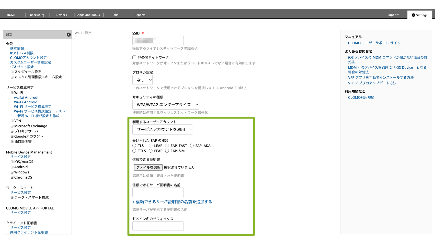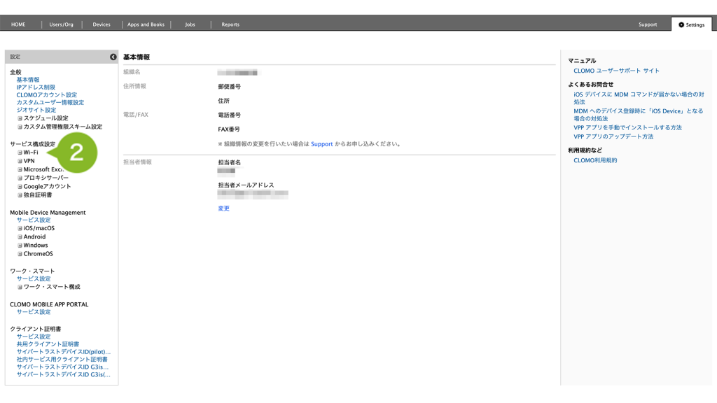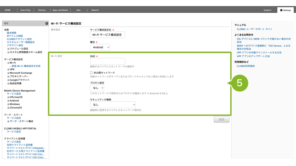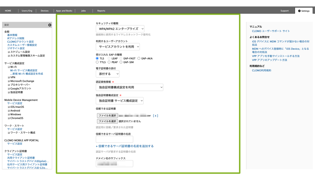 ・サービス構成設定:利用する Wi-Fi 情報や独自証明書を設定します。