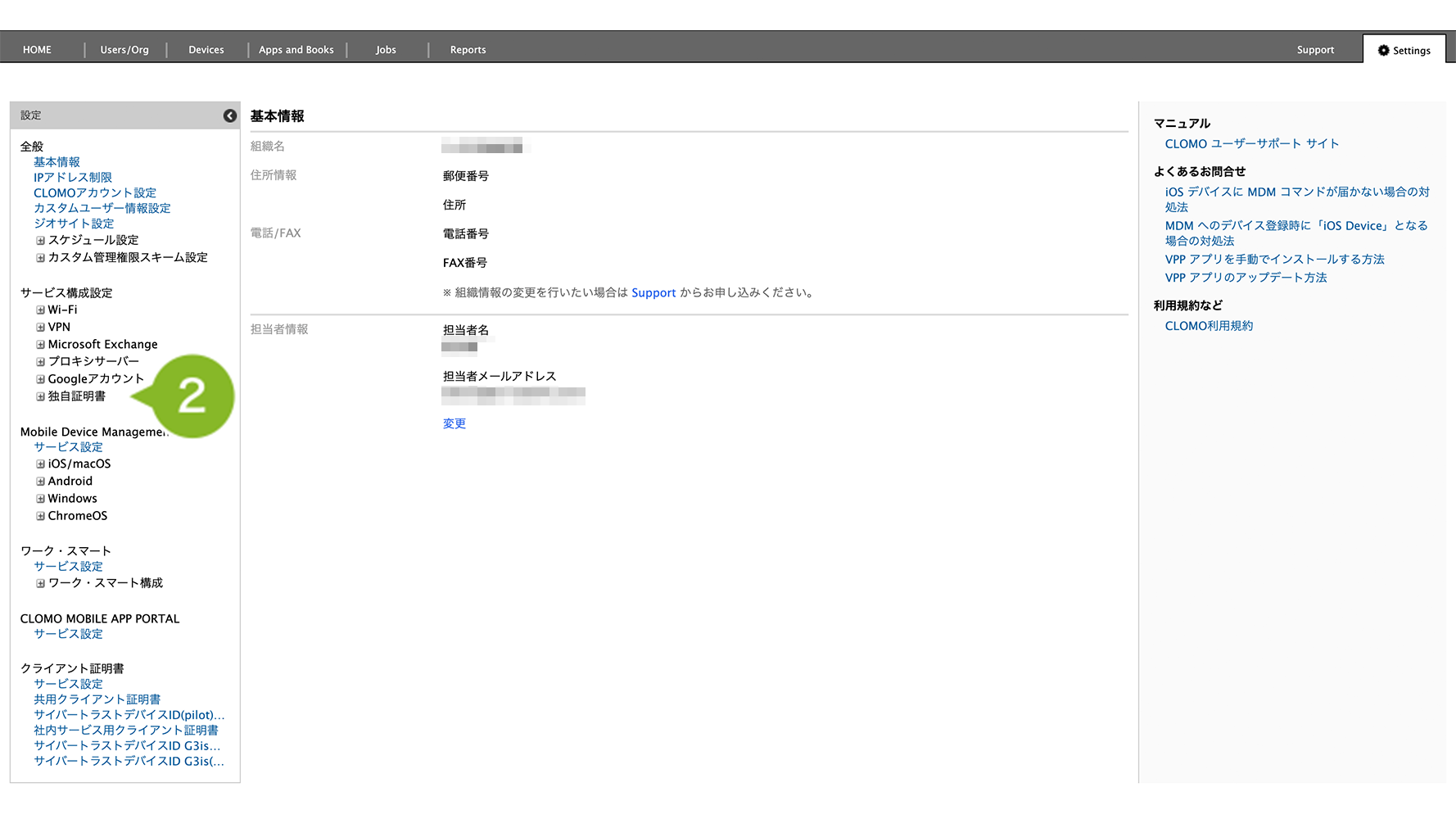 2. サービス構成設定の[独自証明書]をクリックします。